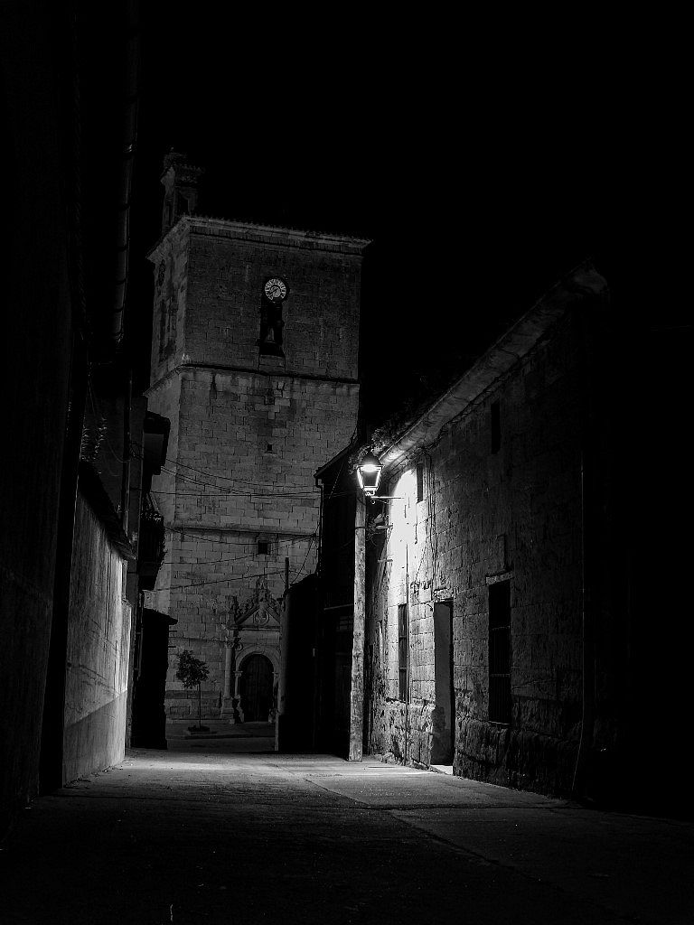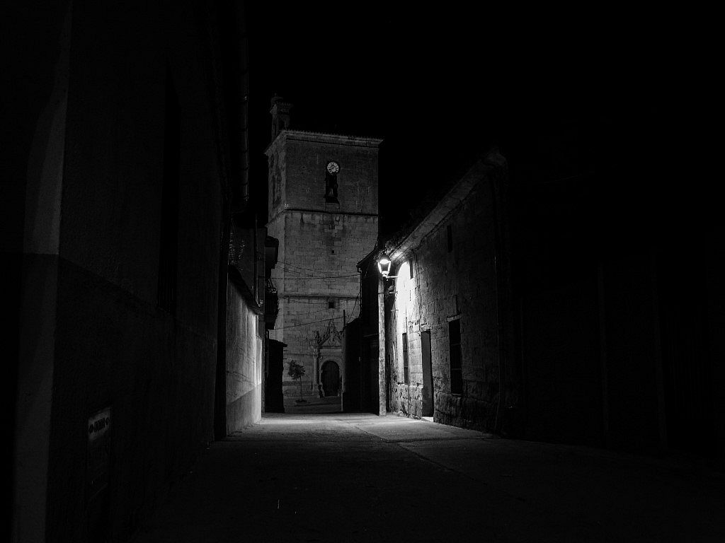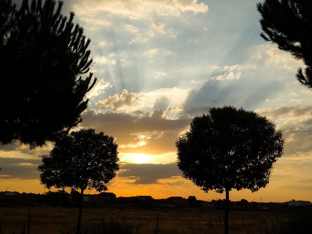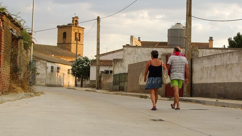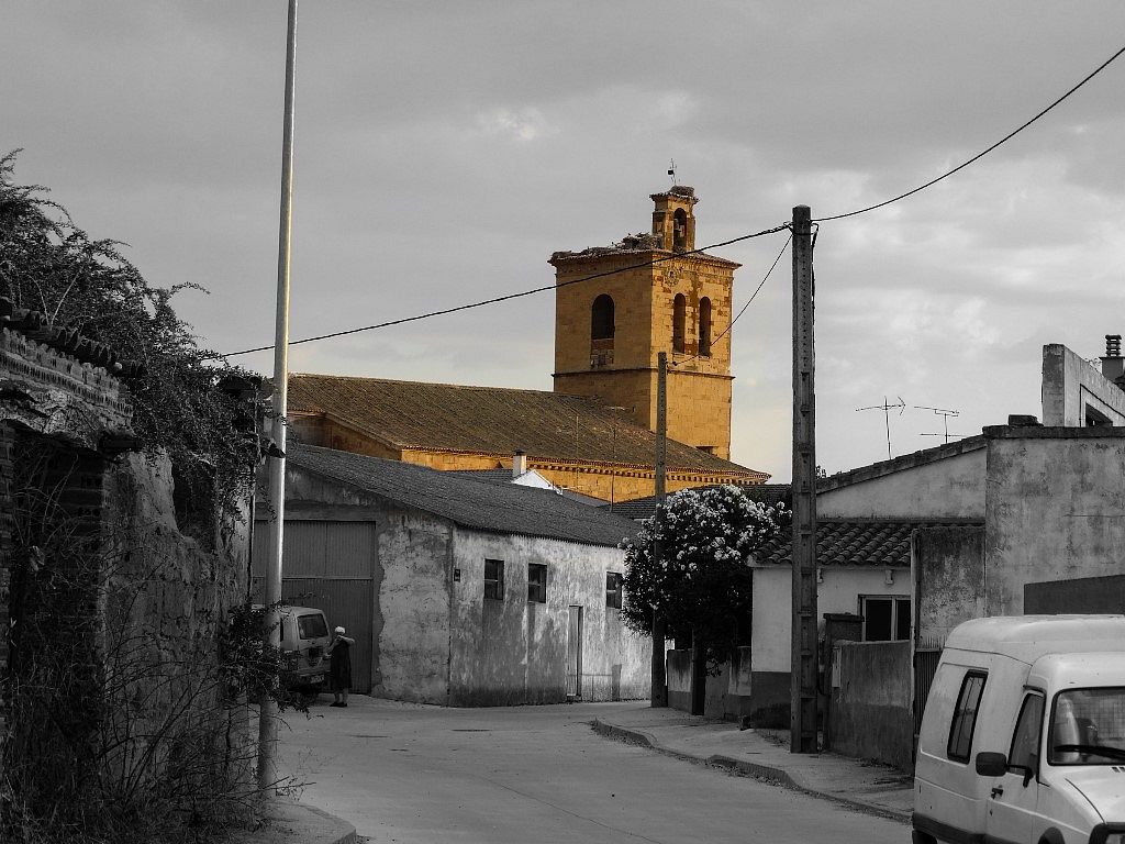 De regreso al pueblo, con los últimos rayos de luz, la torre de la iglesia, a lo lejos, me habla. Todo se va tornando circular, eternamente blando en mi interior. Sentado ya en el canto de casa, coso los recuerdos bajo el cielo azul.