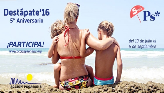 'Destápate'16' celebra este año su quinto aniversario. La iniciativa finaliza el próximo 5 de septiembre. El objetivo: que los pacientes de psoriasis y artritis psoriásica se destapen disfrutando del verano sin complejos y animen, con sus imágenes, a otras personas a hacerlo. El funcionamiento es fácil: la persona afectada por la patología envía una fotografía disfrutando de esta época del año, mostrando su psoriasis y/o artritis con naturalidad. Lo puede hacer, a través de Facebook, Twitter, Instagram o al mail de la asociación: psoriasi@pangea.org.