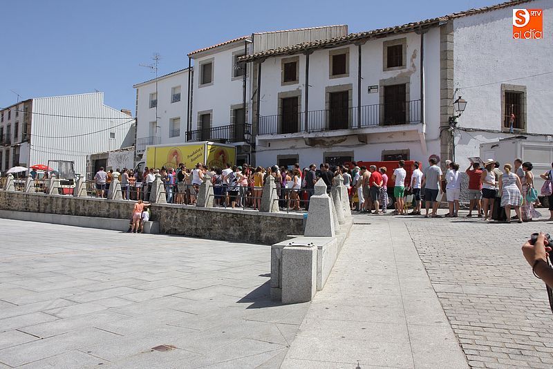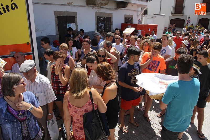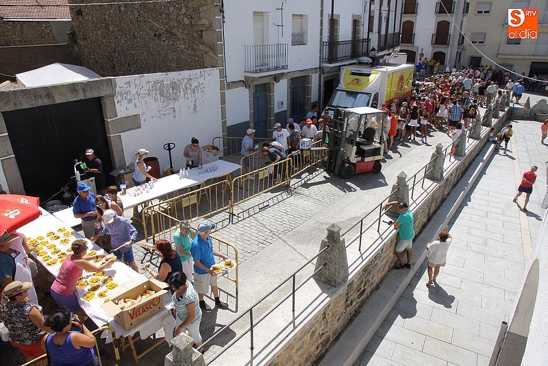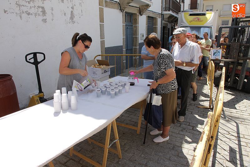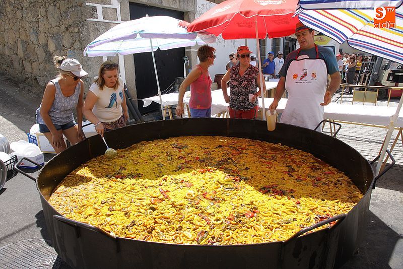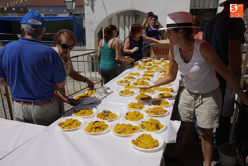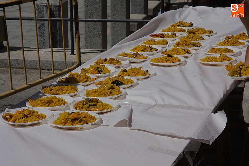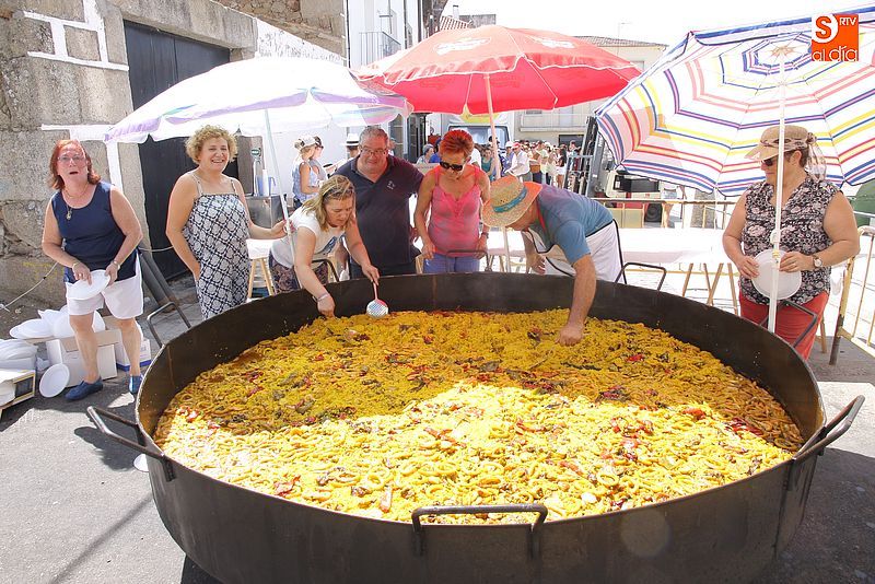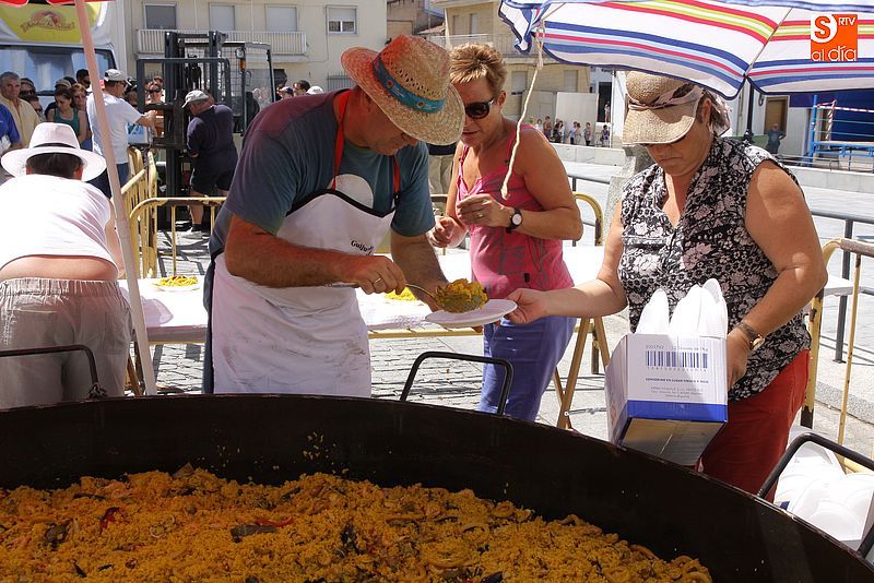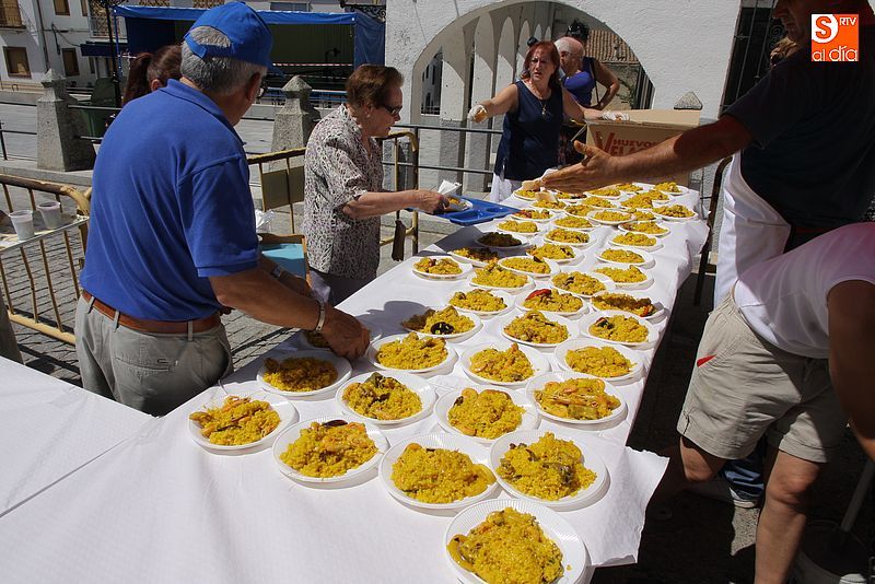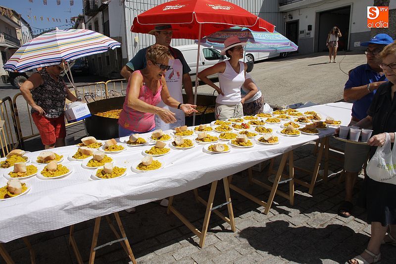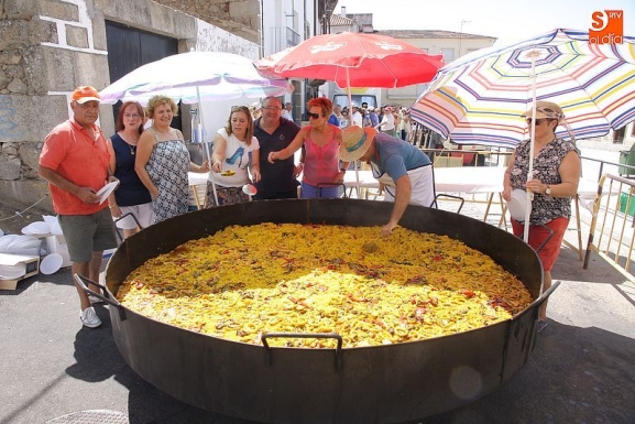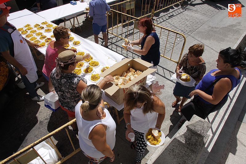 Ledrada comparte su comida más solidaria. La paella popular de las fiestas patronales reunió a un total de 700 personas hoy en la plaza Mayor, que colaboraron con 1 euro cada una para una recaudación que será destinada a La Sonrisa de Alejandro y El Viaje de Andrea, Las ONG que luchan contra diferentes enfermedades infantiles en la provincia. La paella, que estuvo lista en torno a las 14:30 horas, se sirvió bajo un fuerte sol y con la música de la charanga La Escala.