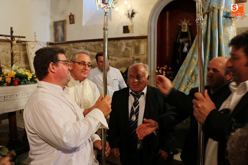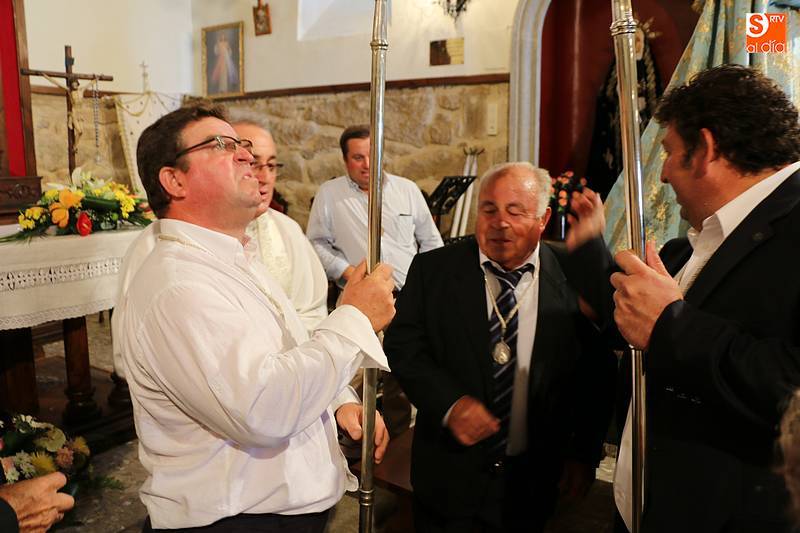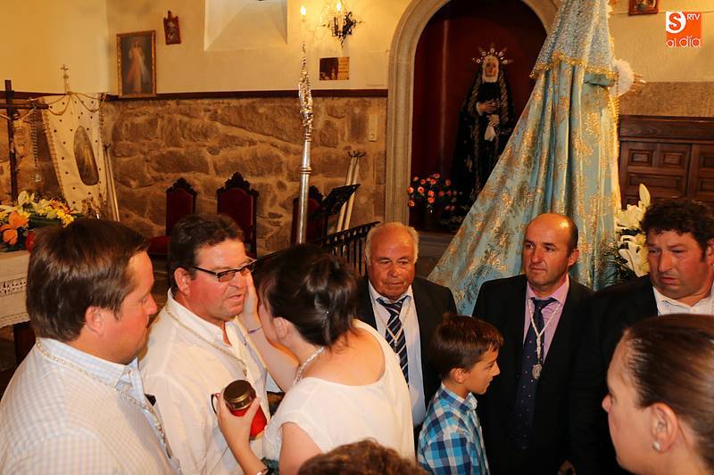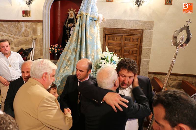 De este modo, la jornada comenzaba con una misa a la que seguía el ofertorio. La Virgen de los Caballeros salía a hombros escoltada por los cofrades para situarla junto a la Casa Consistorial, lugar donde cientos de fieles entregarían sus donativos a beneficio de la Parroquia y cuyo acto estuvo presidido por los mayordomos Manuel Calderón Sánchez y Ángel Antonio García Hervalejo, los mismos que momentos después, ya en la ermita, entregaban las varas a los hermanos Manuel José y Fernando Calderero Mateos, nuevos mayordomos y que servirán a su Reina durante un año tras recibir la bendición en el pequeño templo.