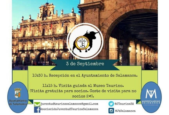Juventud Taurina de Salamanca ha programado para el próximo 3 de septiembre una nueva actividad previa al inicio de la Feria de la Virgen de la Vega. Se trata de una recepción en el Ayuntamiento a las 10:30 horas y una visita guiada al Museo Taurino de Salamanca a las 11:30 horas. Será una actividad gratuita para todos los socios y tendrá un coste de 2 euros para los no socios.