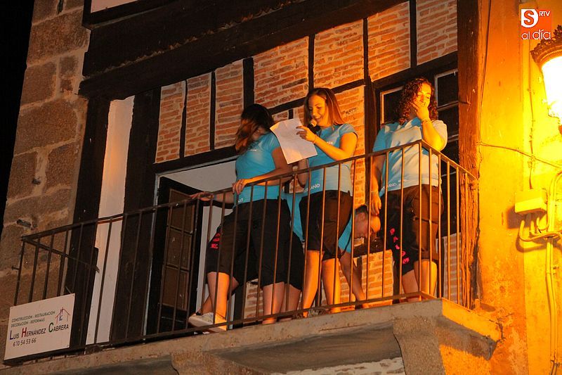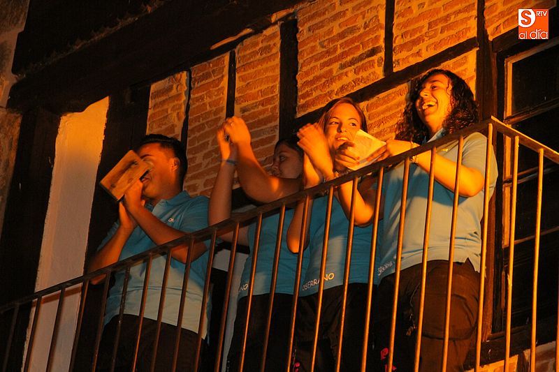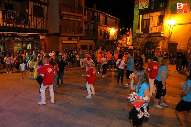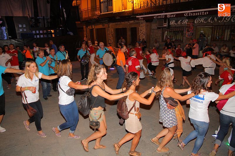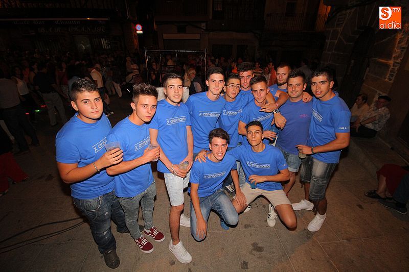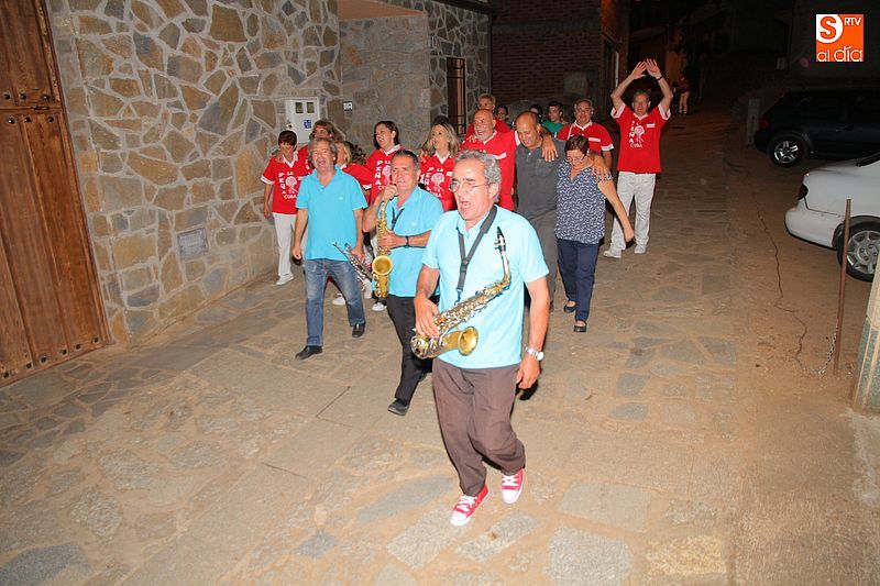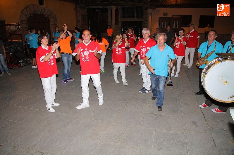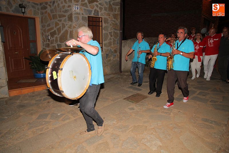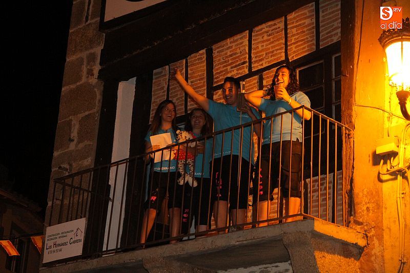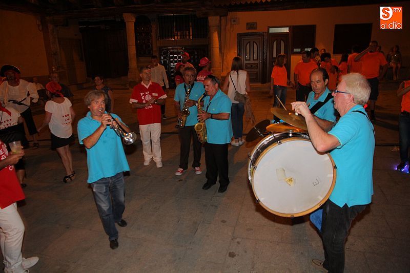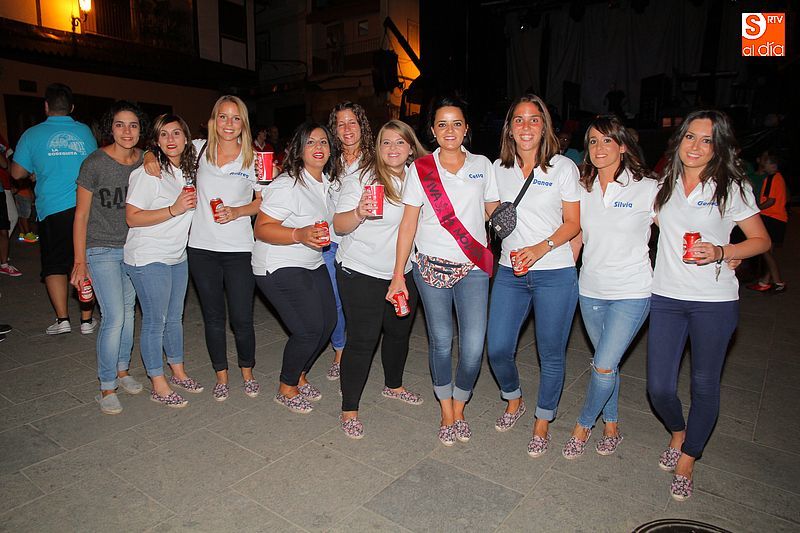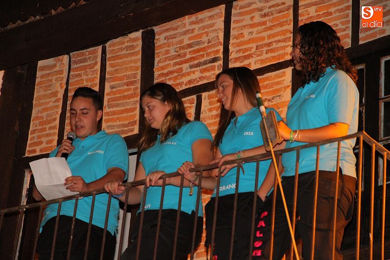 En torno a las diez de la noche se reunieron las peñas en la plaza Mayor, donde la música de la charanga El Bombazo actuó de reclamo para las peñas, ya fueran de jóvenes o mayores, que pronto se animaron al baile, con divertidas congas por la plaza al son de temas clásicos del verano. Una vez creado el ambiente festivo con las peñas, el público en general también se acercó a la plaza para presenciar la verbena, con la orquesta salmantina Slam, y el pregón, responsabilidad que este año recayó en los miembros de la peña 'La Bodeguita', por su continua colaboración con el Ayuntamiento en la preparación de todo tipo de actos a lo largo del año. Cuatro representantes de la peña subieron al balcón del reloj en la plaza y pronunciaron a cuatro voces un corto, pero intenso pregón, apelando a la participación, la colaboración y el disfrute de todos los vecinos en los festejos que se extenderán hasta el viernes 2 de septiembre.
