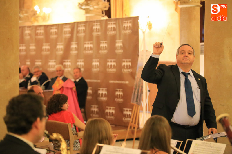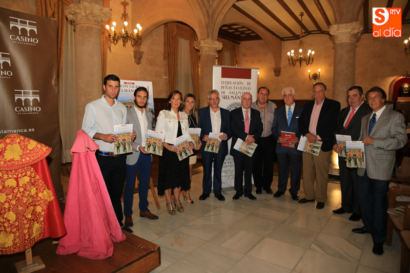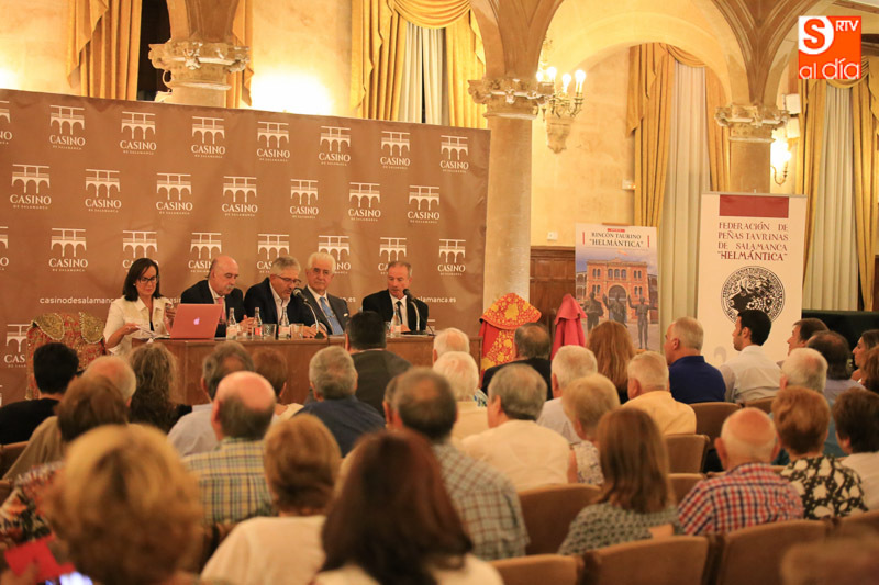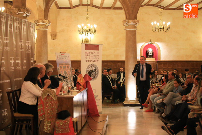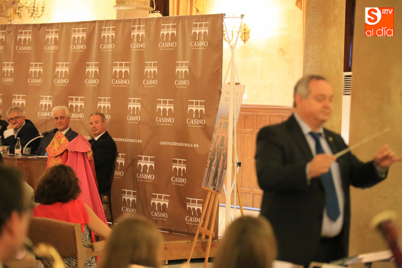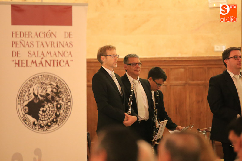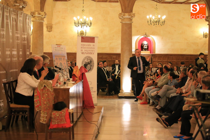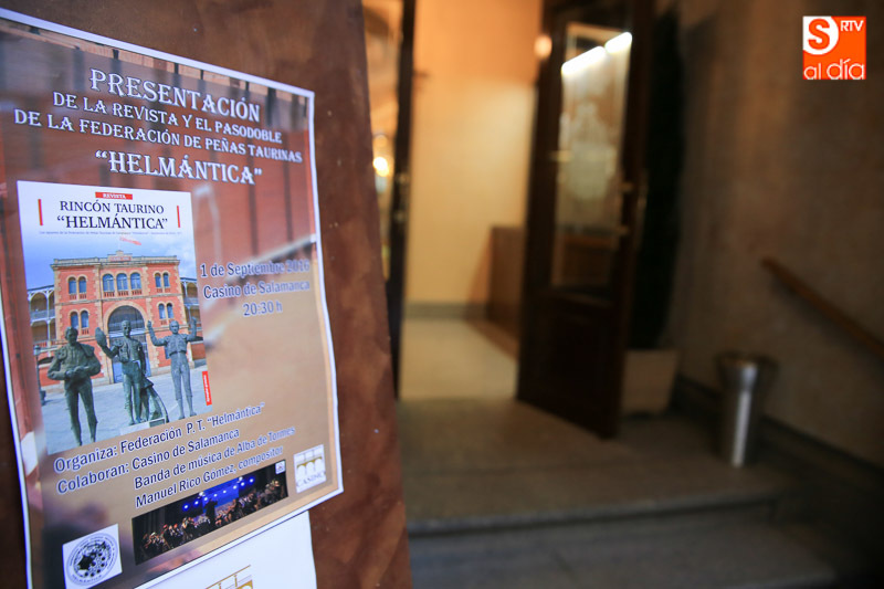 La presentación oficial de la revista 'Rincón Taurino Helmántica' ha reunido esta tarde en el Casino de Salamanca a numerosos aficionados que han querido arropar a la junta directiva de la Federación en la puesta de largo de sus nuevos proyectos. El acto se ha completado con la el estreno del pasodoble que el compositor Manuel Rico Gómez ha compuesto para el colectivo y que ha sido interpretado por la Banda Musical de Alba de Tormes, dirigida por el maestro Mario Vercher Grau.