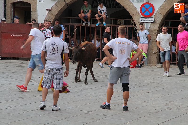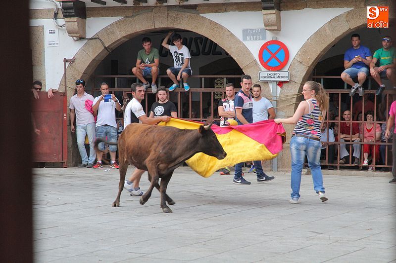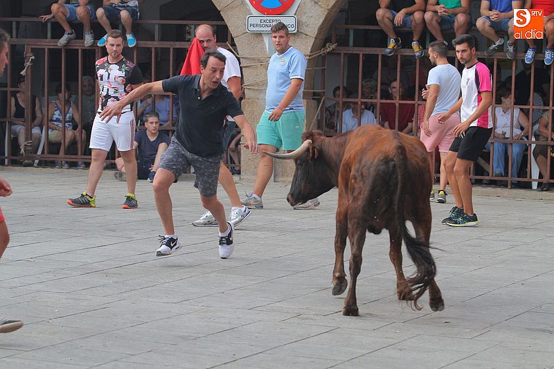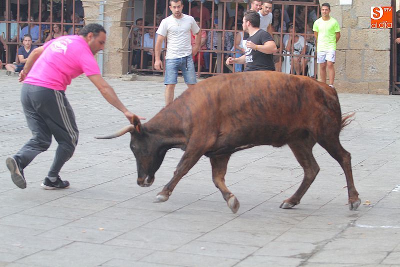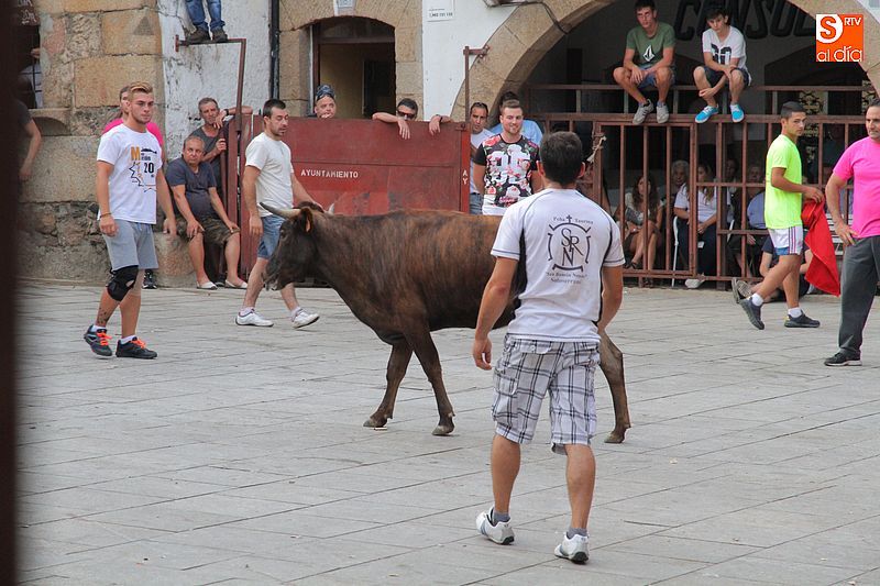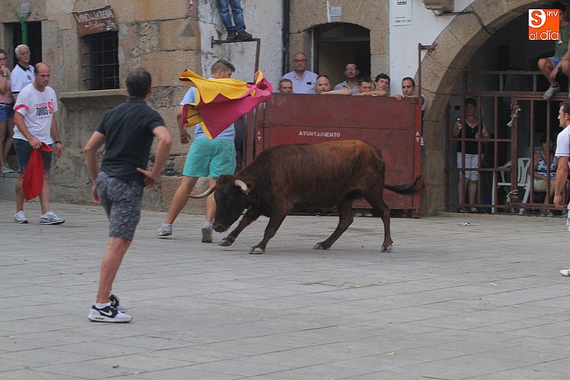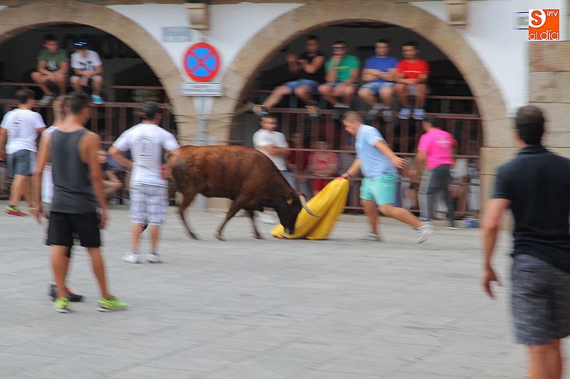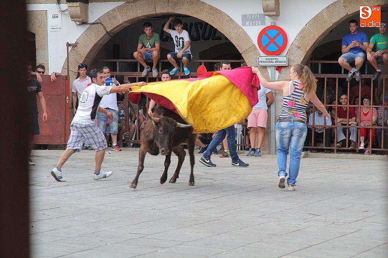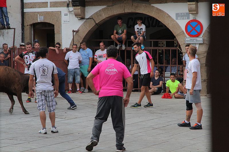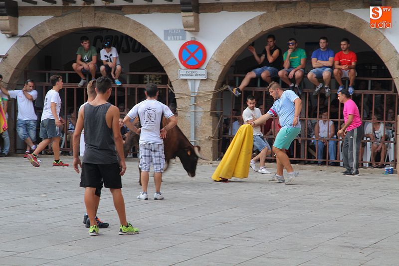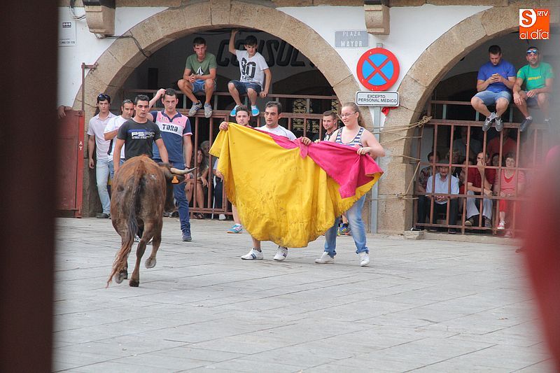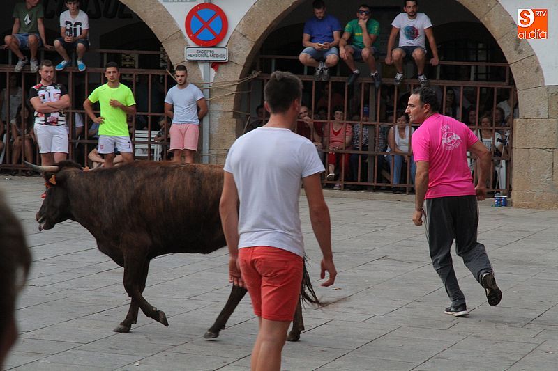 Sotoserrano vivió esta tarde la emoción de las vaquillas con los mejores protagonistas posibles, los propios vecinos. Un total de cuatro animales se soltaron para disfrute de las peñas y todos los valientes que quisieron saltar al ruedo. La plaza Mayor, convertida en coso taurino, se llenó por completo de público que abarrotó los burl