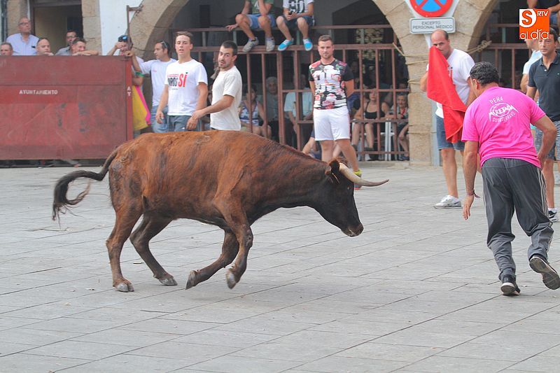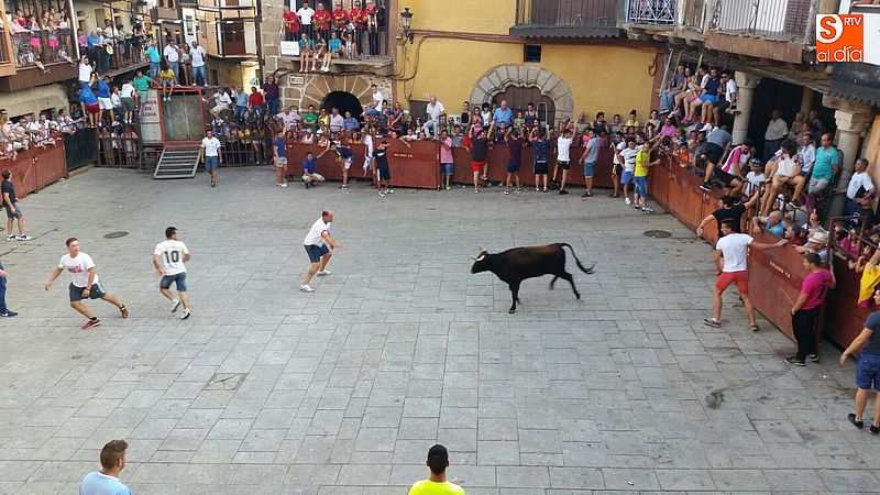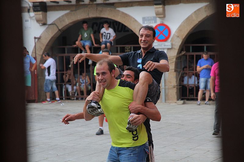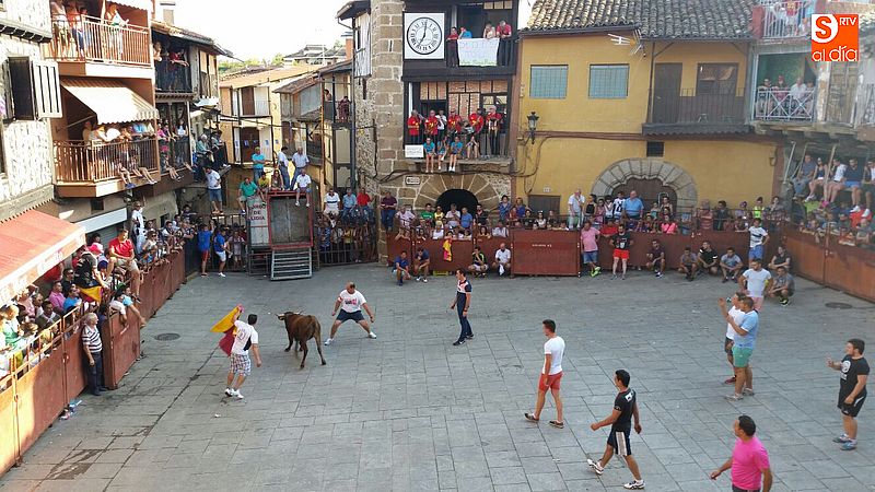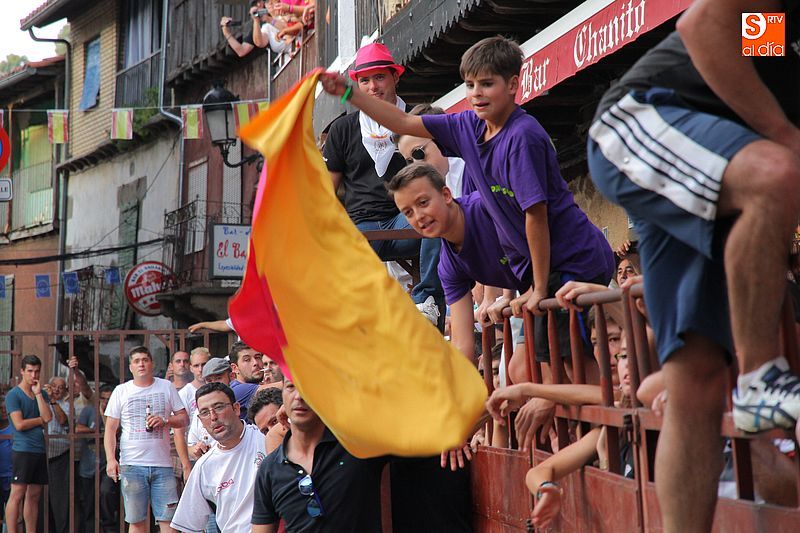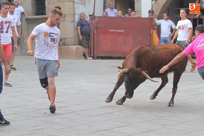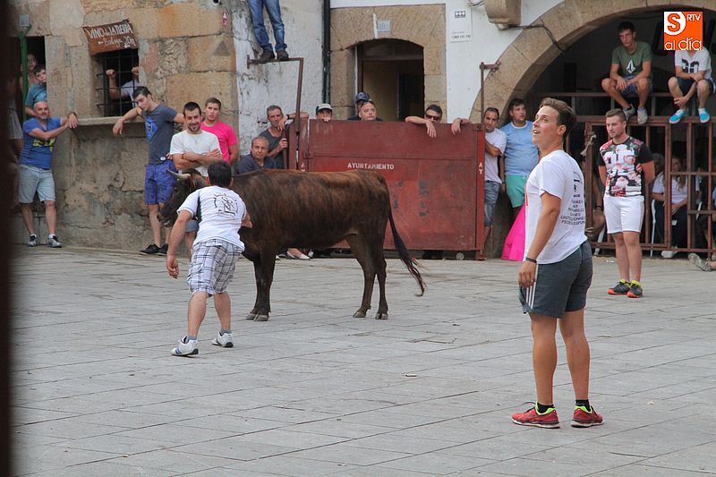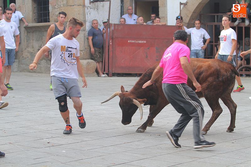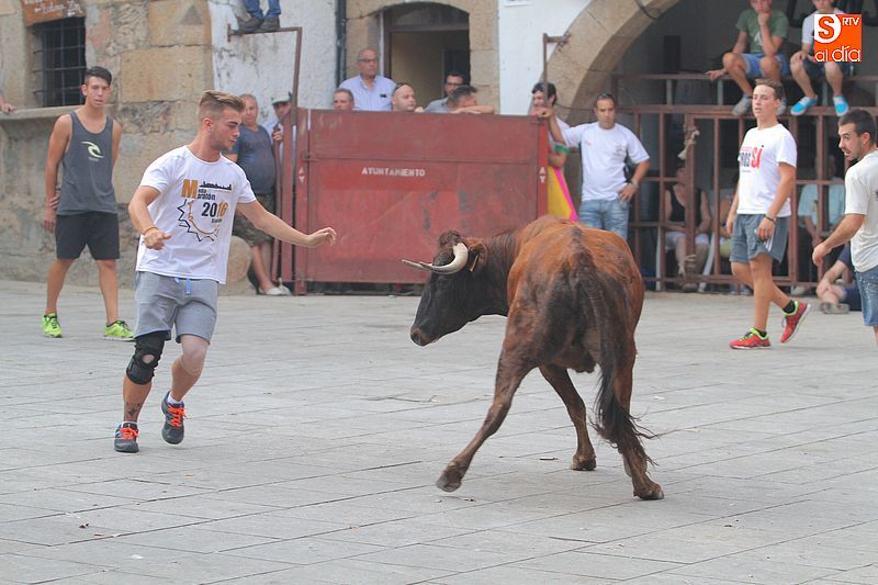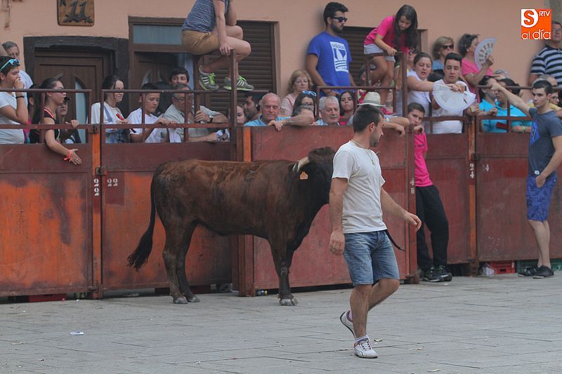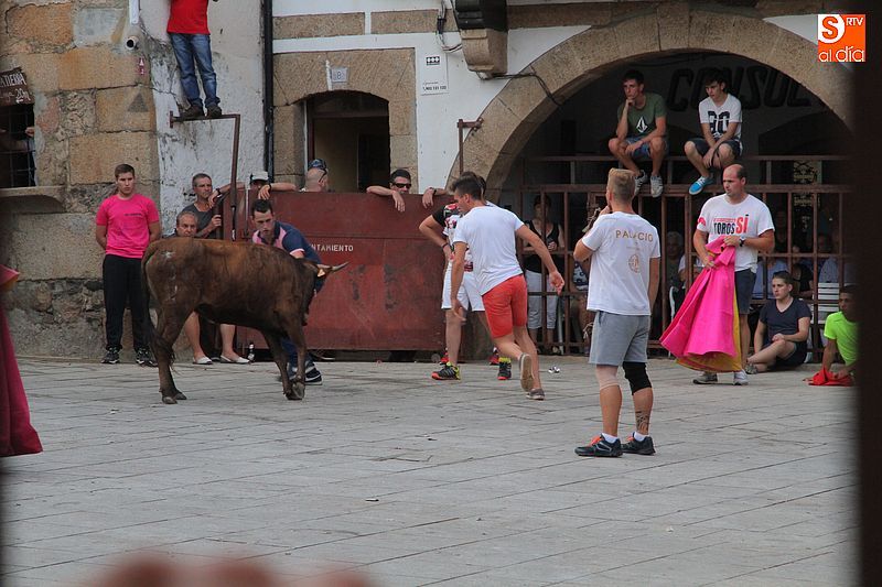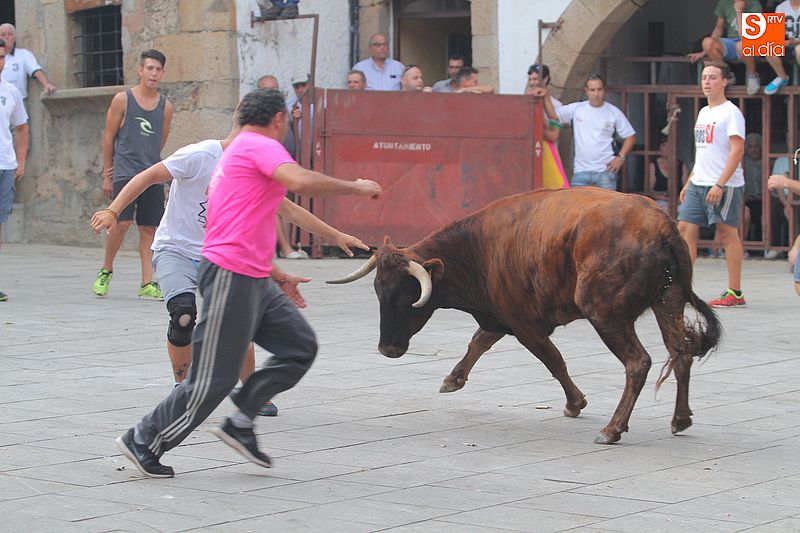 Sotoserrano vivió esta tarde la emoción de las vaquillas con los mejores protagonistas posibles, los propios vecinos. Un total de cuatro animales se soltaron para disfrute de las peñas y todos los valientes que quisieron saltar al ruedo. La plaza Mayor, convertida en coso taurino, se llenó por completo de público que abarrotó los burl