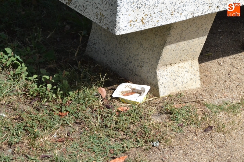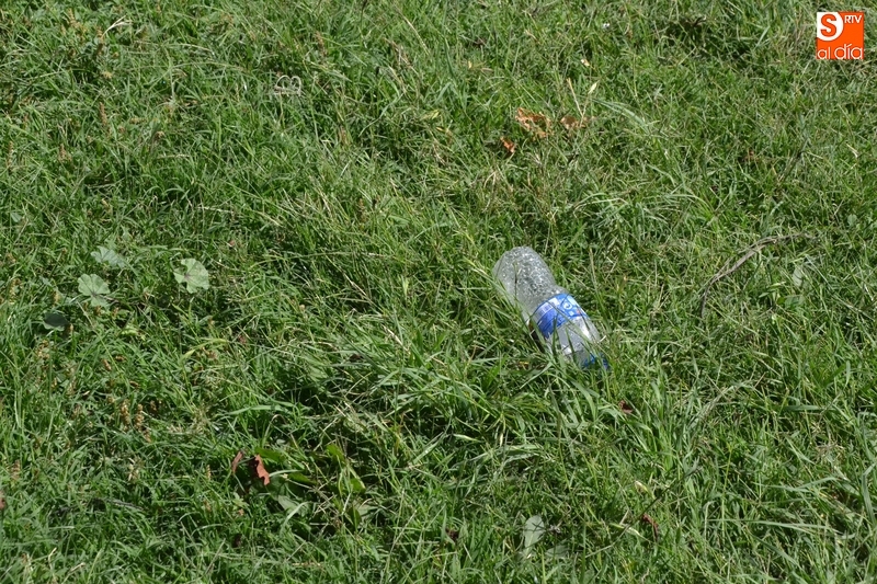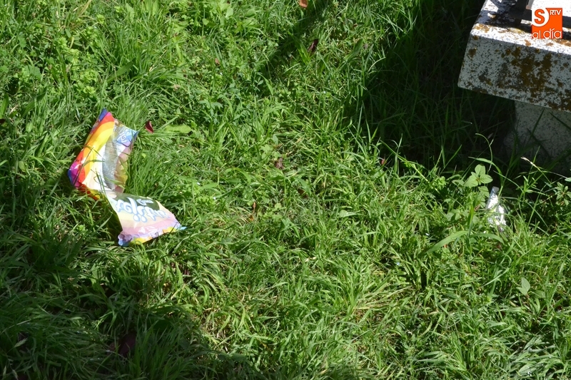 Lo que más llama la atención ahora mismo en el parque del Valle de San Martín son los desperdicios de basura que han ido arrojando al suelo (en este caso, al césped) los usuarios, como un recipiente de natillas, una botella de agua o envoltorios vacíos de golosinas y helados.