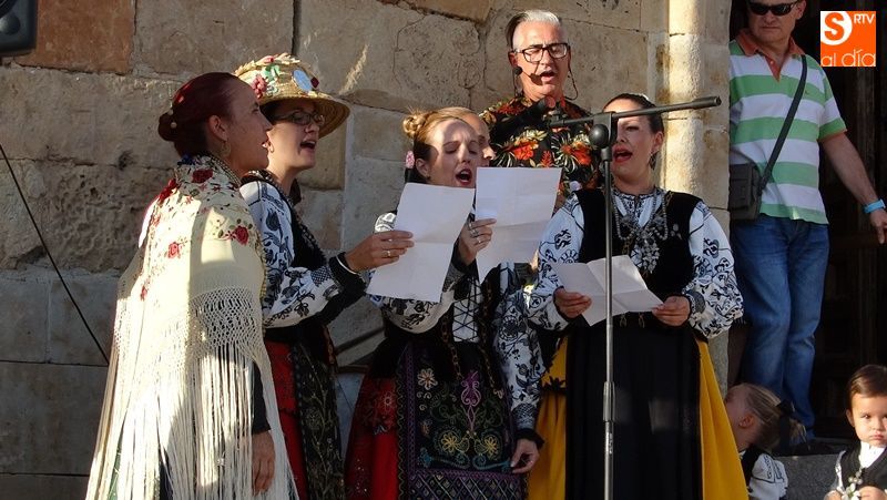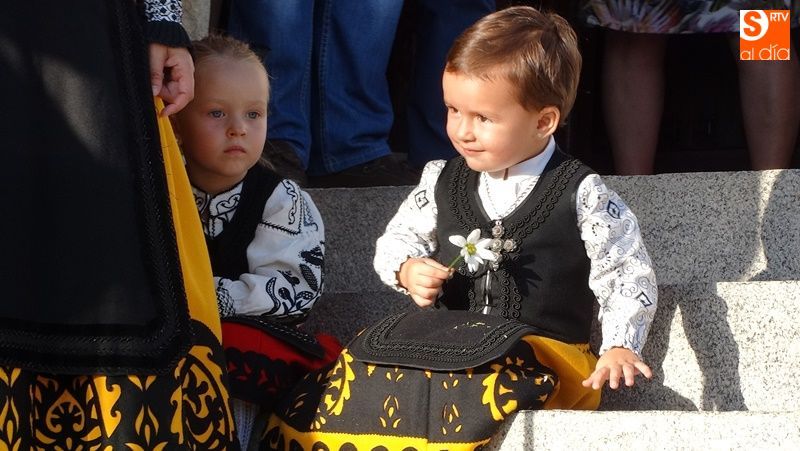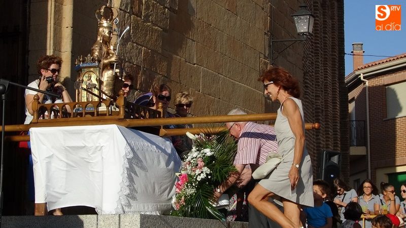 Los vecinos de Villoria han demostrado su devoción por la patrona del municipio, la Virgen de la Vega, en la ofrenda floral celebrada justo después del pregón que ha iniciado las fiestas. Han ido desfilando delante de la imagen de la Virgen, a la que han dejado sus ramos de flores para después decir unas palabras a los asistentes.