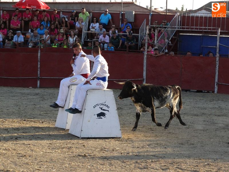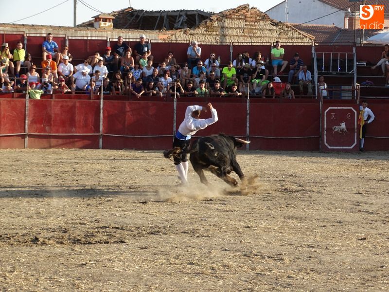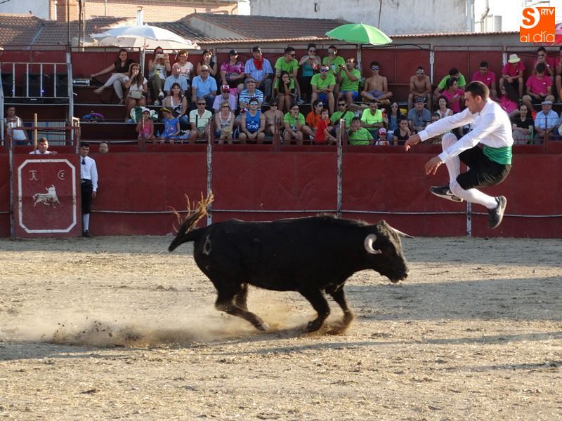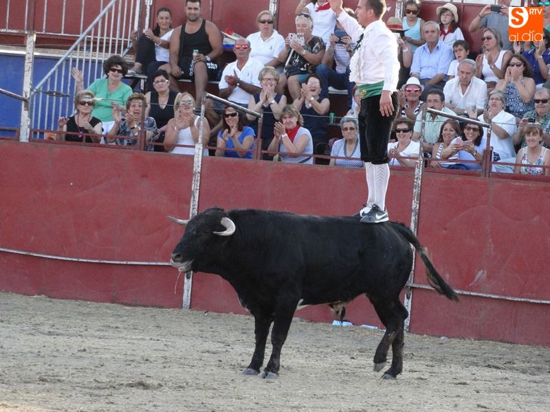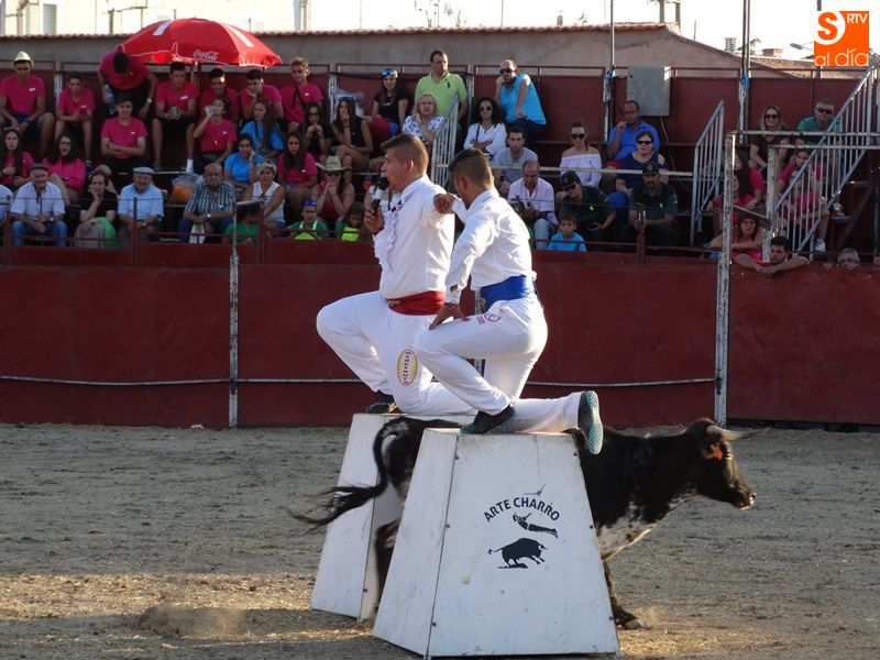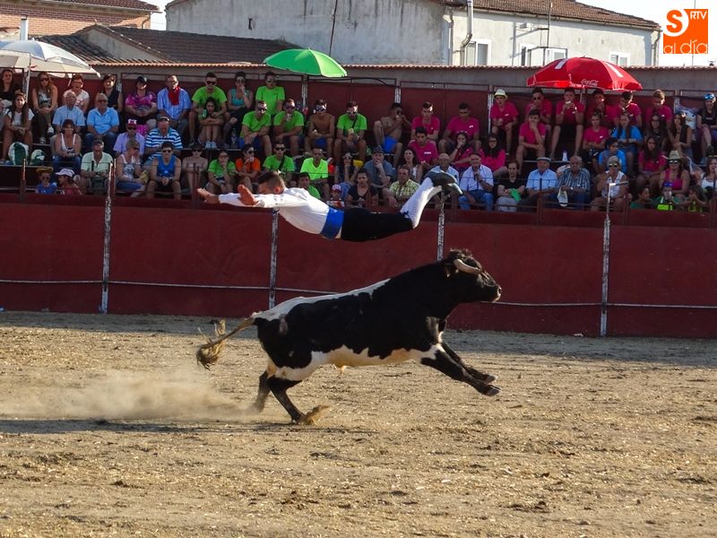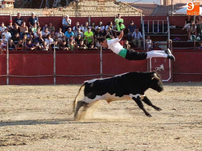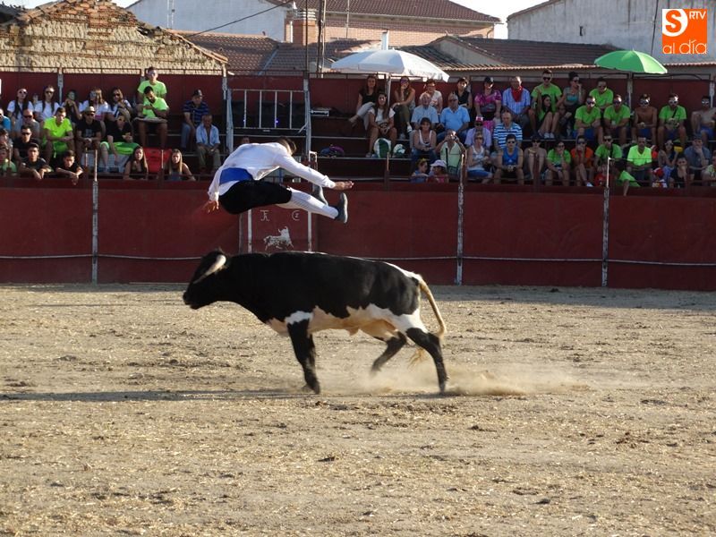 El grupo de recortadores 'Arte Charro' ha dado lo mejor de sí mismo este jueves en la plaza de toros de Cantalapiedra, donde han ofrecido una espectacular exhibición de saltos, cortes y quiebros que ha sido aplaudida con ganas por los vecinos. El evento ha contado con un público muy numeroso, en la zona de sombra no quedaba ningún hueco libre.