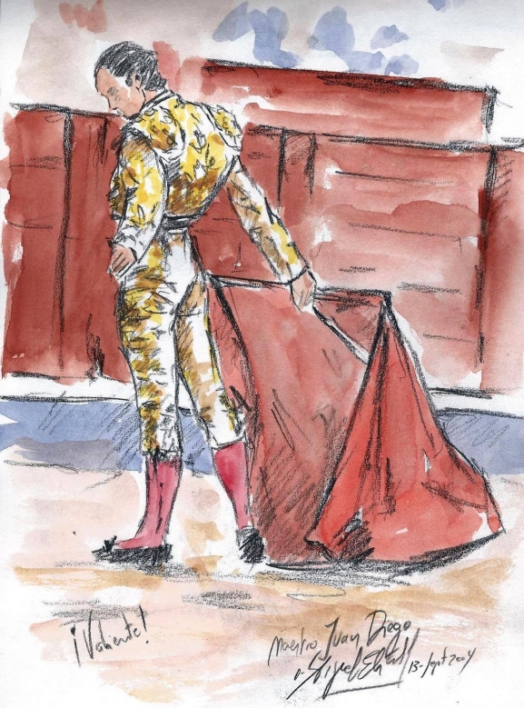 En su mirada resbala la ternura de un lejano sol de primavera. En el coso, todo se llena de aire rojizo hasta sentir una especie de orfandad, esa nostalgia que sostiene en sus alas los recuerdos de tantas miradas, de tanto sentimiento y belleza, la misma que se percibe al contemplar este hermoso dibujo de Miguel Elías.