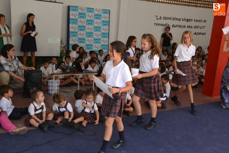 Misioneras-Santa Teresa coloca los primeros fotogramas de su película ‘Deja ser’   | Imagen 1La parte principal del acto fue la creación de los primeros fotogramas de esa película del nuevo curso, a la que le han puesto como título Deja ser. Para ello, representantes de cada curso pisaron la alfombra instalada en el patio, al estilo de las alfombras que se colocan en los estrenos de cine, para colocar en un panel de fotogramas una serie de monigotes humanos y unos carteles con los principios que van a seguir este año.