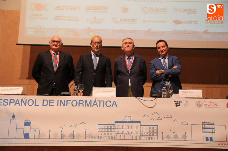 El rector estuvo acompañado por Juan Manuel Corchado, presidente del congreso; Francisco Tirado, presidente del Comité Científico, y Miguel Toro, presidente de la Sociedad Científica Informática de España.