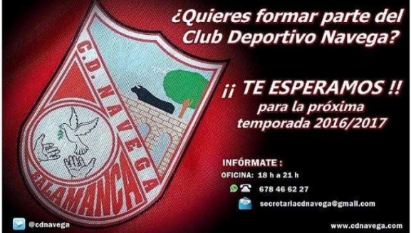 "Todavía estas a tiempo de jugar en el Club Deportivo Navega en la temporada 2016/2017, si estas interesado y te gusta jugar de portero o de jugador contacta urgentemente con nosotros, todavía quedan plazas libres. Te esperamos!