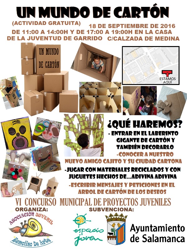 La Asociación Juvenil Remolino de Arte organiza este domingo, en la Casa de la Juventud de Garrido (calle Calzada de Medina), 'Un mundo de cartón'. Se trata de una propuesta lúdica de carácter gratuito, para todo tipo de público, aunque centrada en los jóvenes y los niños, que se desarrollará de 11.00 a 14.00 y de 17.00 a 19.00 horas