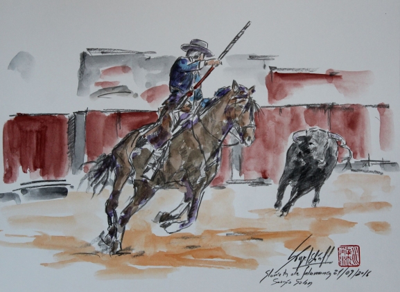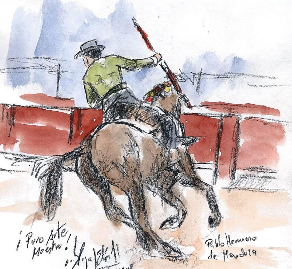 A golpes de viento al galope, como una gacela vuela entre aplausos, rozando el pitón. Caballo blanco, toro negro. Citando, un jinete con gracia fija su mirada en el toro. Algarabía en los tendidos. (Jclp)