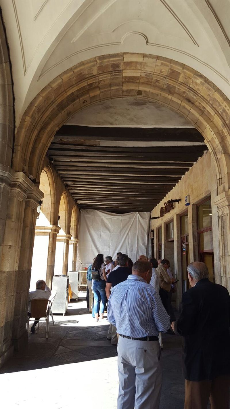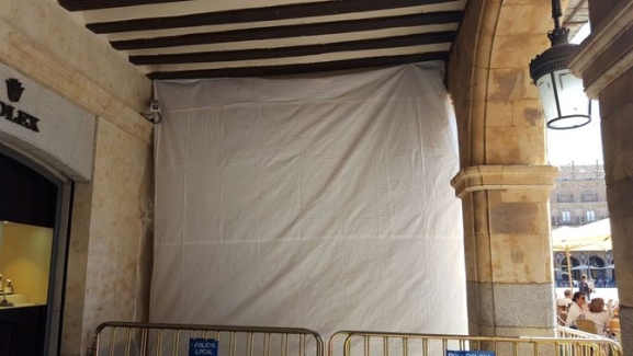 El Ayuntamiento de Salamanca ha comenzado los trabajos de reparación de la viga de los soportales de la Plaza Mayor, situada entre la cafetería Las Torres y la joyería Torrico, que cedió el pasado 24 de agosto y obligó al vallado de la zona afectada como medida de seguridad.