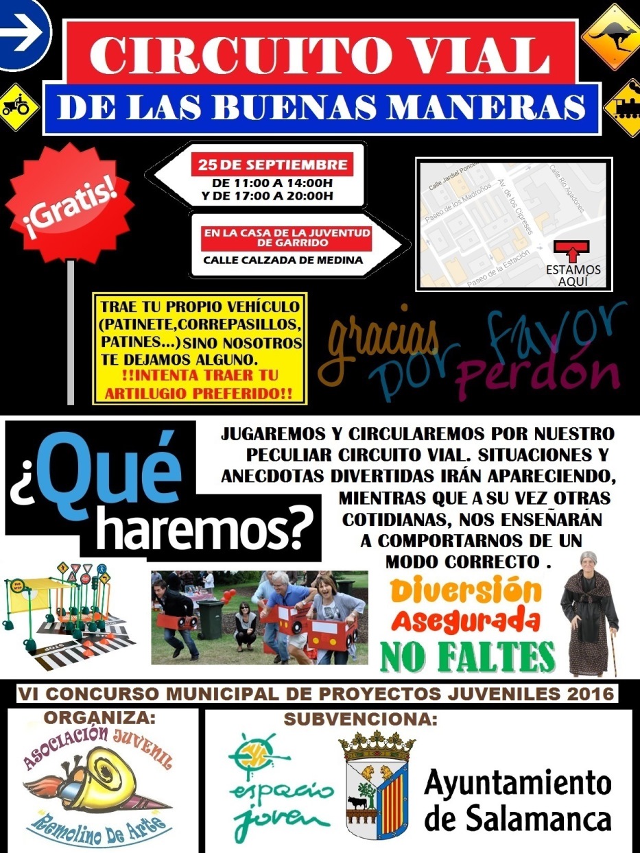 Este domingo día 25 de Septiembre, en la Casa de la Juventud de Garrido (calle Calzada de Medina), la Asociación Juvenil Remolino de Arte organizará el Circuito Vial de las Buenas Maneras. Una propuesta que ha recibido un premio en la modalidad de educación en valores en el VI concurso de proyectos juveniles organizado por el Espacio Joven y el Ayuntamiento de Salamanca.
