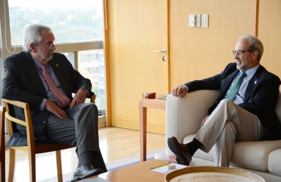 Antes de su visita a la Oficina de Representación de la Universidad de Salamanca en la UNAM, Daniel Hernández Ruipérez tuvo ocasión de mantener un encuentro de trabajo con el rector de la Universidad Nacional Autónoma de México, Enrique Graue Wiechers, en el que se abordó el desarrollo de un programa más activo de movilidades, tanto de estudiantes como de académicos, y el fomento de la investigación multilateral, entre otros temas.