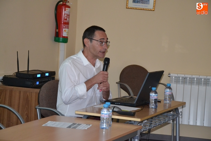 A continuación, comenzaron las dos conferencias programadas. En primer lugar, el Doctor en Historia del Arte y miembro de la Fundación Santa María la Real del Patrimonio Histórico José Luis Hernando Garrido habló sobre la Catedral de Ciudad Rodrigo, que define como un "canto del cisne de la escultura tardorrománica hispana". Durante su intervención, fue comparando elementos arquitectónicos de la Seo mirobrigense con los de otros templos.