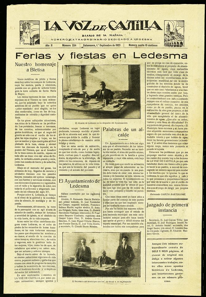 "Voces metálicas de júbilo y fiestas caen hoy sobre los campos de Ledesma, cuya faz austera, parda y silenciosa, preside con un gesto de señorial hidalguía la torre cubierta de Santa María La Mayor". Así lo relataba La Voz de Castilla. Diario de la mañana, en un número extraordinario, editado en septiembre de 1923, dedicado a la villa y que desde la Biblioteca Municipal de Ledesma han localizado en la Biblioteca Virtual de Prensa Histórica del Ministerio de Cultura, como parte de la labor de búsqueda y digitalización de todo tipo de documentos (originales o archivos digitales) curiosos, históricos, publicaciones descatalogadas... sobre la villa.