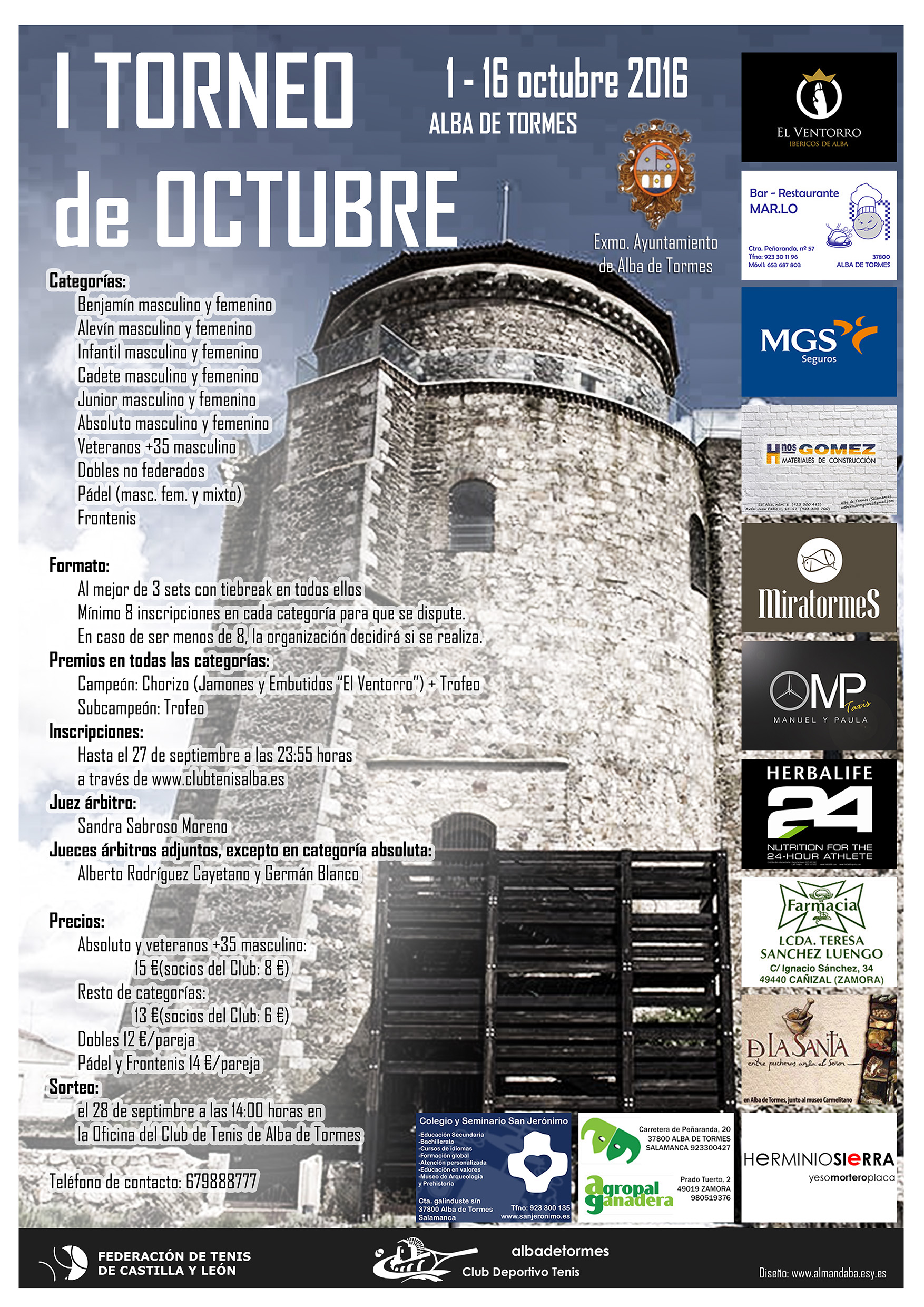 De nuevo, el Club Deportivo Tenis Alba de Tormes organiza de la mano de Alberto Rodríguez y Sandra Sabroso su torneo de octubre, que, como cada año, coincidirá con las Fiestas Patronales de Santa Teresa. La competición tendrá lugar los fines de semana comprendidos entre el 1 y el 16 de octubre, y se celebrará en las pistas municipales de tenis de la villa ducal.