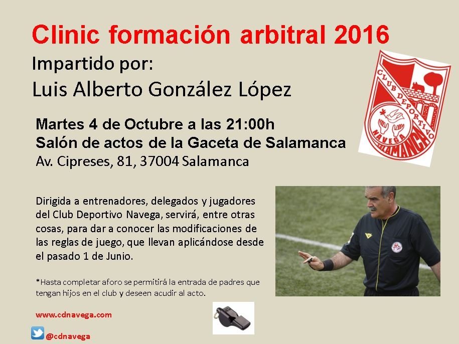 El próximo martes 4 de octubre, a las 21.00 horas, en el salón de actos de La Gaceta, en la avenida de los Cipreses, los entrenadores, delegados y jugadores del Club Deportivo Navega asistirán a una conferencia del profesor de la Escuela de Árbitros de Salamanca, Luis Alberto González.