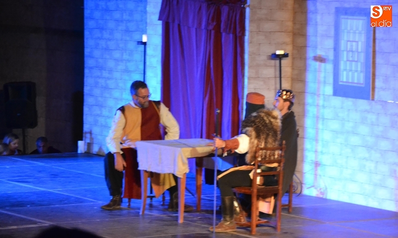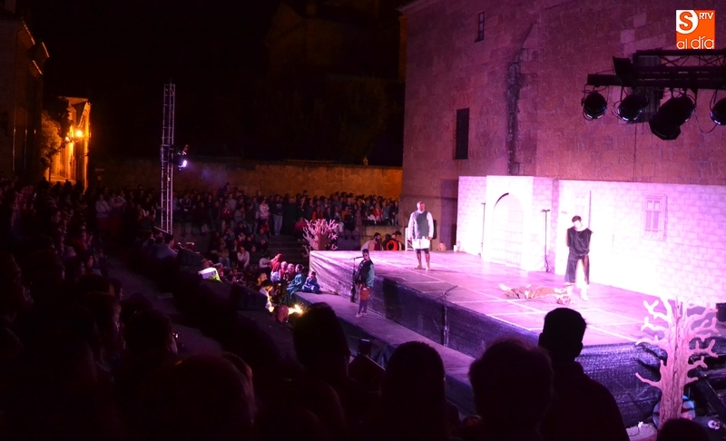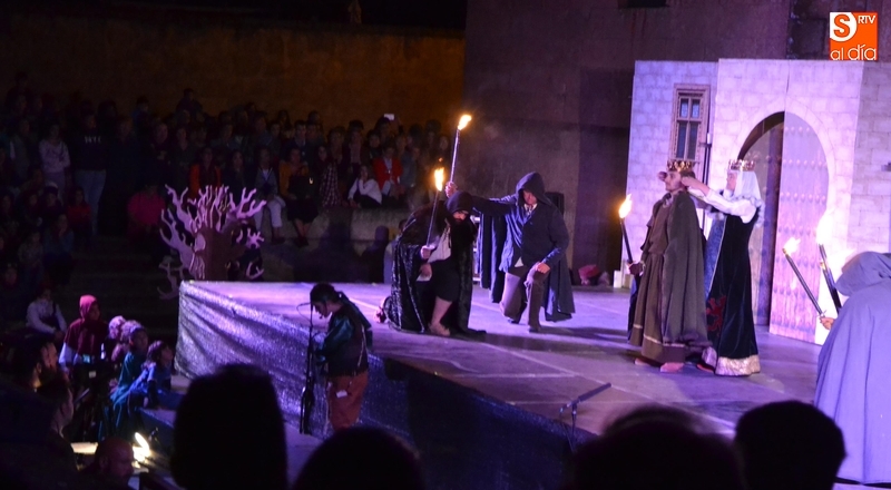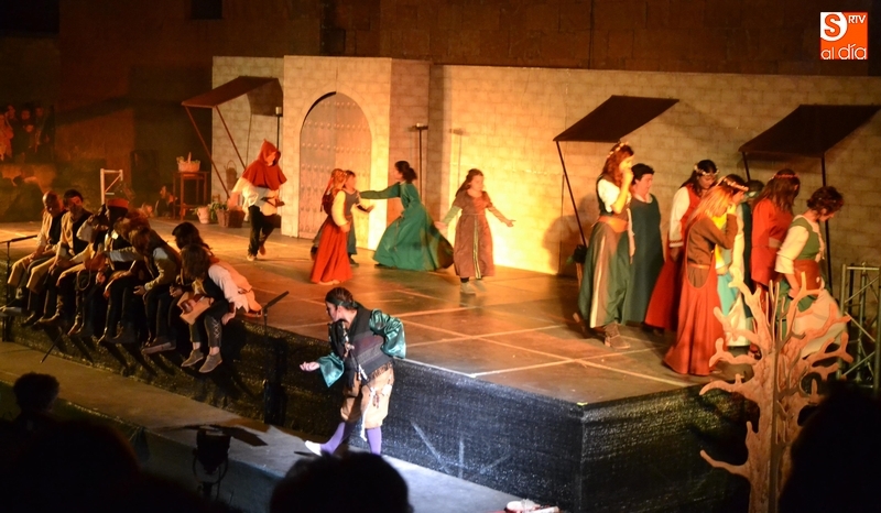 A la hora del desarrollo de la obra, ejerció como narradora Popy Vegas, que fue introduciendo las distintas partes al numerosísimo público congregado en la Plaza de Amayuelas, que llenó por completo la grada allí instalada así como todos los rincones aledaños, llegando varias personas a seguir la obra desde la muralla.