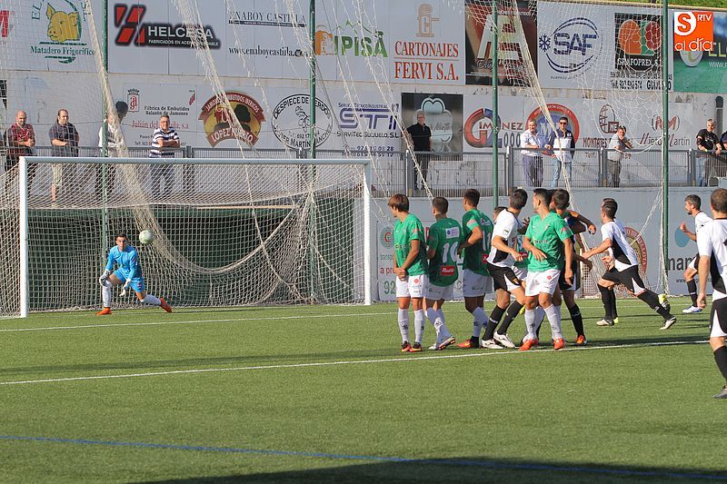 Mateo García, quien volvió a ver el partido desde la grada por seguir sancionado, se encontró con una plantilla corta de recursos, pero con jugadores de calidad para afrontar el partido. Con un dibujo táctico similar a lo visto en los últimos partidos, los chacineros saltaron al terreno de juego con más ímpetu que el Tudelano, que se dedicó los primeros minutos a esperar que los acontecimientos se fueran produciendo. La espera fue beneficiosa para los visitantes, puesto que Óscar Vega aprovechó un buen balón para marcar el primer tanto antes del primer cuarto de hora. El Guijuelo acusó fuertemente el gol en contra, intentando contener al rival sin conseguirlo. El gol dio alas a los de Sergio Amatriain quienes se adueñaron del centro del terreno de juego. La presión que ejerció el equipo visitante permitió la falta al pie del área de la que nació el segundo gol. Ibai lanzó la falta con mucha puntería en la base del poste, donde Kike Royo no logró detenerla pese a llegar sin problemas. El segundo gol convirtió los últimos quince minutos de la primera parte en un trámite con un Guijuelo que no veía el momento de volver a vestuarios.