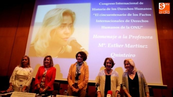 Con motivo del congreso internacional 'El cincuentenario de los Pactos Internacionales de Derechos Humanos de la ONU', este martes, en el Salón Actos Facultad Geografía e Historia, se ha tributado un homenaje a la trayectoria profesional de la profesora Martínez Quinteiro, vinculada durante cuarenta y siete años a la Universidad de Salamanca, especialista en Derechos Humanos y creadora de una amplia Escuela internacional de estudios interdisciplinares sobre el tema.