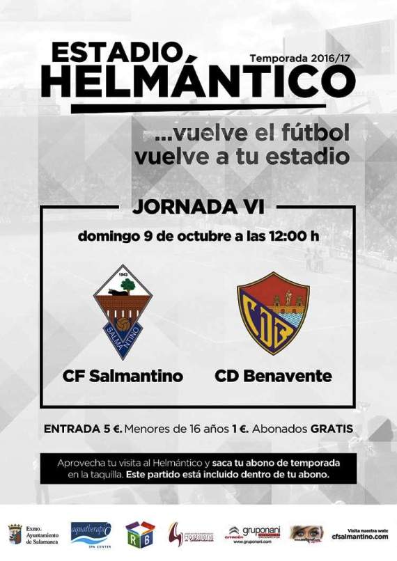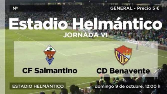 El domingo, a las 12 horas, el CF Salmantino estrenará liderato de la categoría ante su afición en el estadio Helmántico, donde recibirá al CD Benavente, uno de los clásicos del fútbol regional en los últimos años. Para este encuentro, el club pone a disposición de los aficionados las entradas bien ese día en taquilla o bien on-line, a través de la url https://goo.gl/ehrgYL.