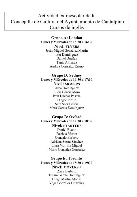Los lunes y miércoles, desde las 15,30 a las 19,30, los niños cantalpineses disfrutarán de las clases, motivadoras y distendidas, según destacan los padres. "Los niños van muy ilusionados a las clases; no la ven como una mera actividad educativa, sino como un proceso de aprendizaje desde el juego, porque disfrutan de sus contenidos y de los métodos pedagógicos que se emplean", asegura Elena Sánchez, concejala de Cultura y Educación en el Consistorio cantalpinés, colaborador activo en esta iniciativa.