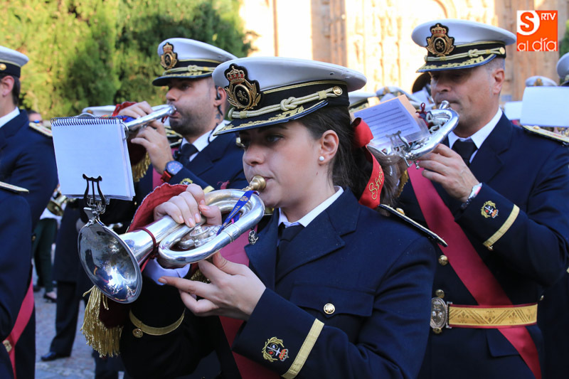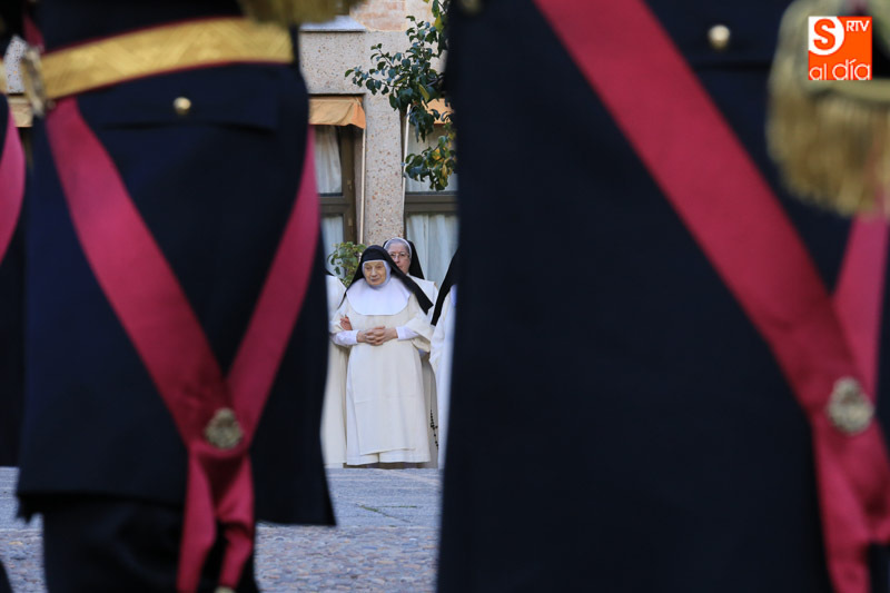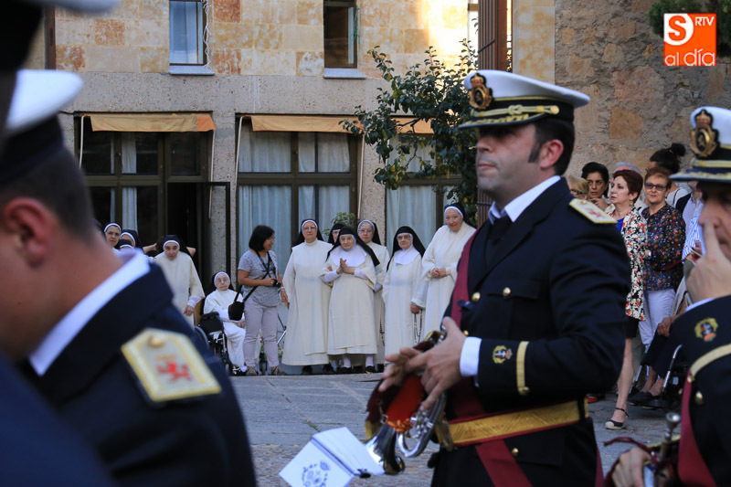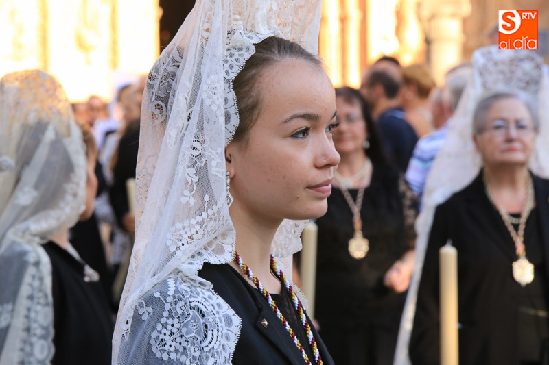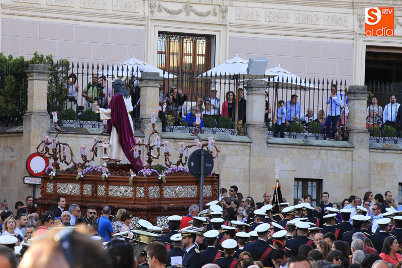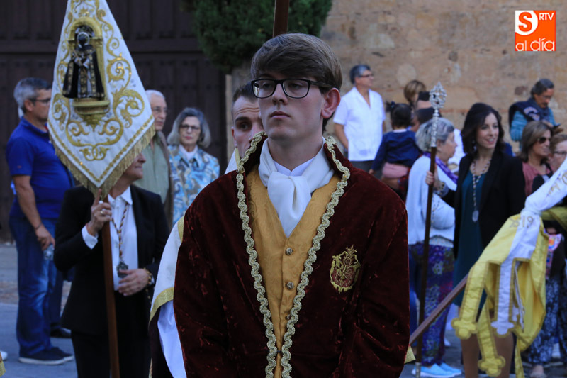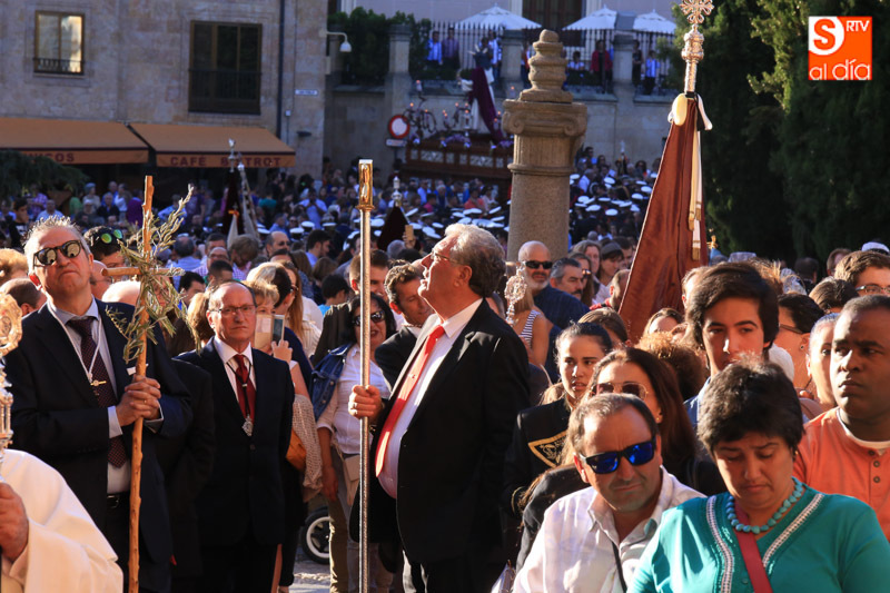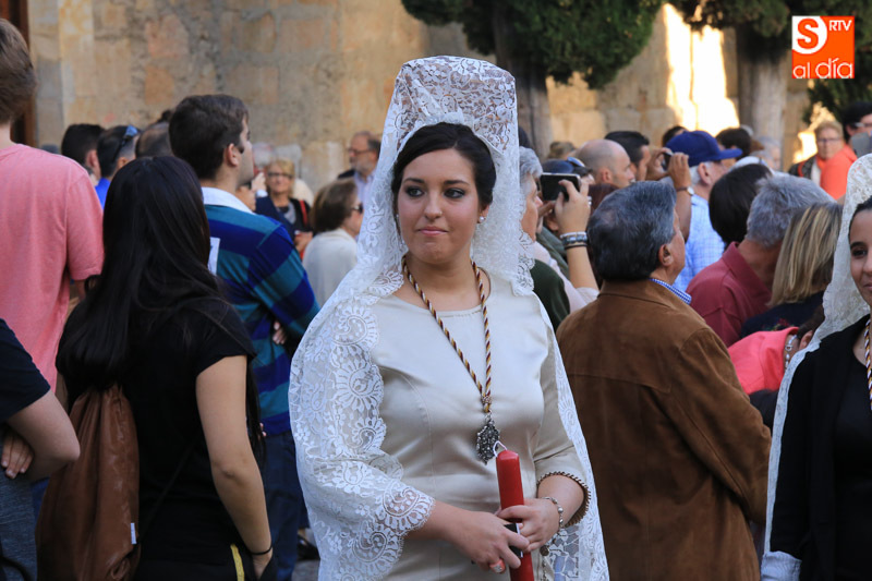 Nada más comenzar el recorrido, el cortejo procesional se detenía ante el portalón de las RR. MM. Dominicas (Dueñas) que recibían al Cristo y la Virgen con el canto de la Salve, ya que son madrinas de ambas imágenes. El acto central de la procesión se celebraba en la Catedral Nueva de Salamanca, donde se realizaba una oración al Santísimo Sacramento en la Capilla Mayor.