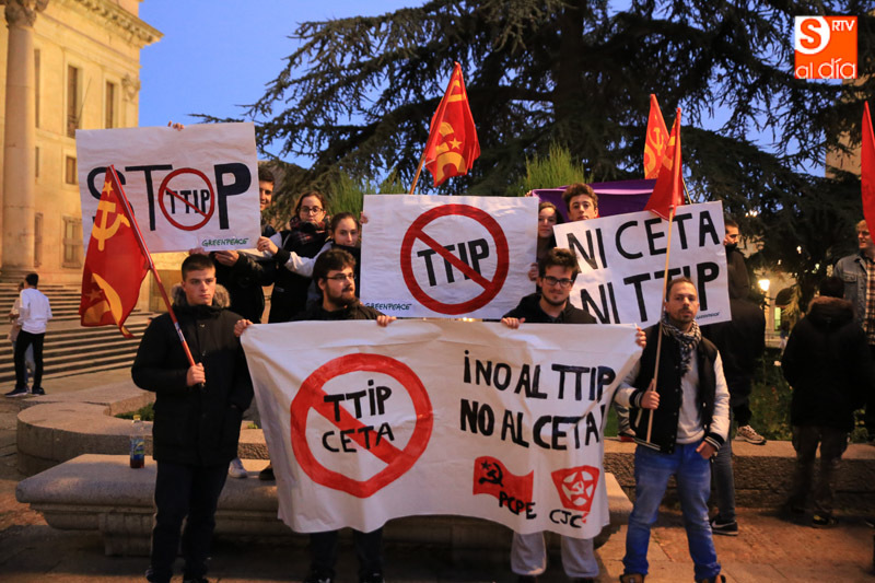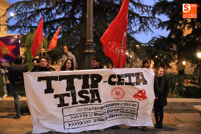 La manifestación contra los tratados comerciales CETA y TTIP, que ha partido de Anaya hasta la Plaza Mayor, es una iniciativa de las Marchas de la Dignidad de Salamanca, que se suman a organizaciones sindicales, campesinas, políticas y culturales que en otras ciudades de España y Europa están promoviendo "un otoño en resistencia exigiendo, de manera clara y contundente, la suspensión de, los mal llamados, acuerdos de libre comercio e inversión", explican los convocantes. Los manifestantes, convocados por la Plataforma Salamanca Stop TTIP, han mostrado su rechazo a acuerdo como el CETA que negocian la UE y Canadá y el TTIP que están abordando la UE con EEUU.