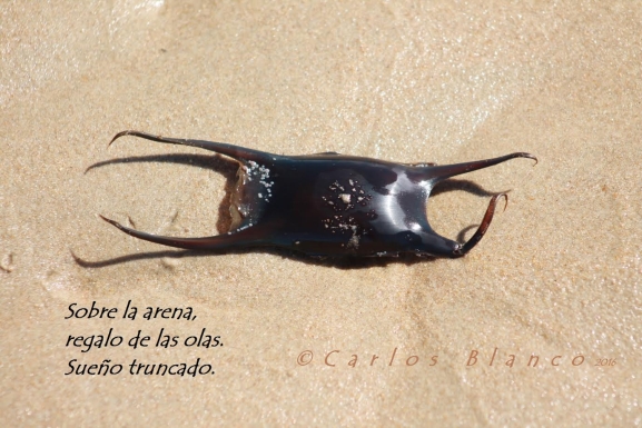 Mecido por las olas y carente de vida, quiso el destino que nuestros caminos se encontraran y ahora lo admiro sobre este lecho arenoso e involuto. Como si de un preciado tesoro se tratase, sabedor que me ha de acompañar en viaje de regreso, lo tomo entusiasmado con dos dedos y meticulosamente lo pongo sobre la palma de la mano; lo admiro, lo protejo y prosigo mi paseo satisfecho con mi hallazgo.