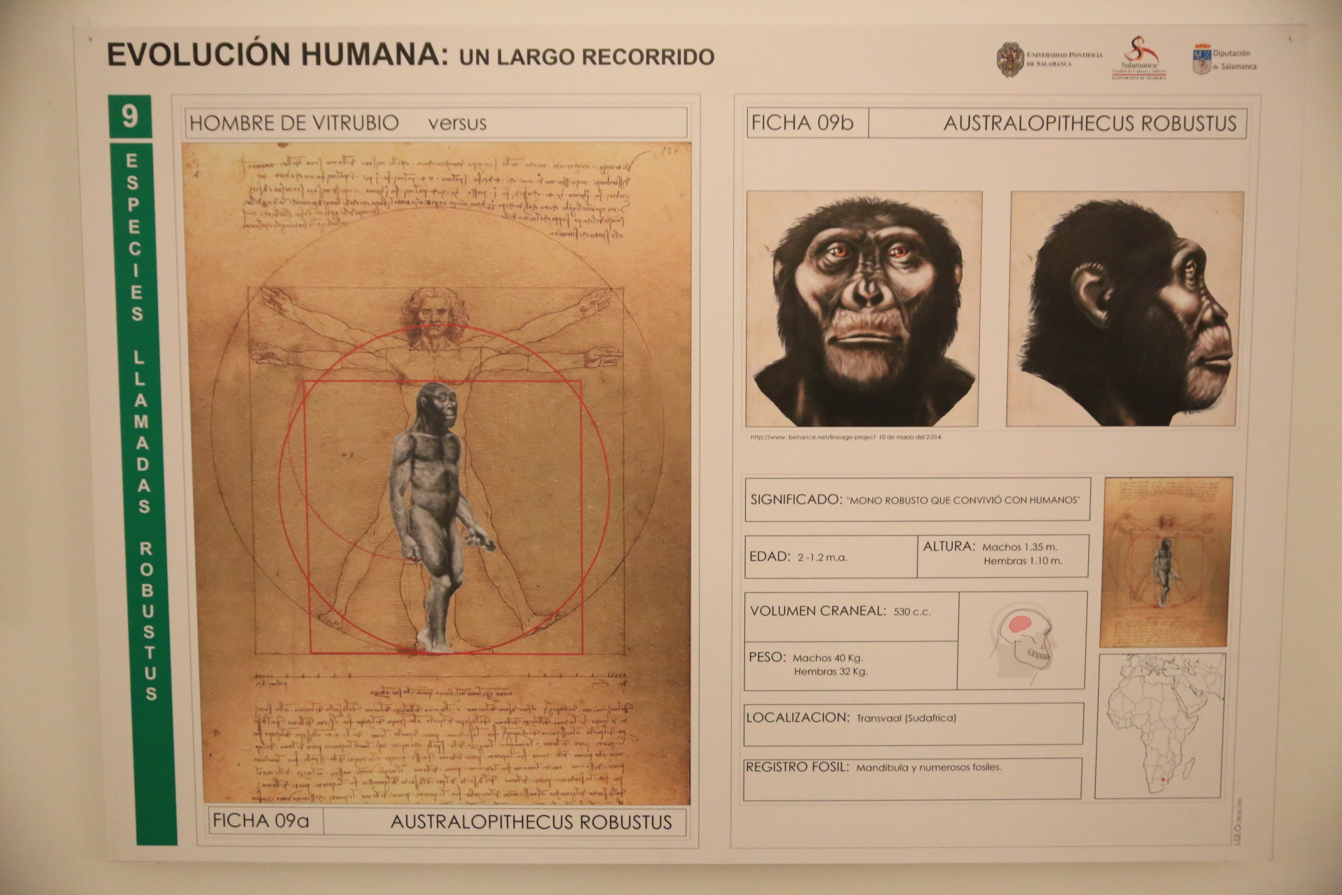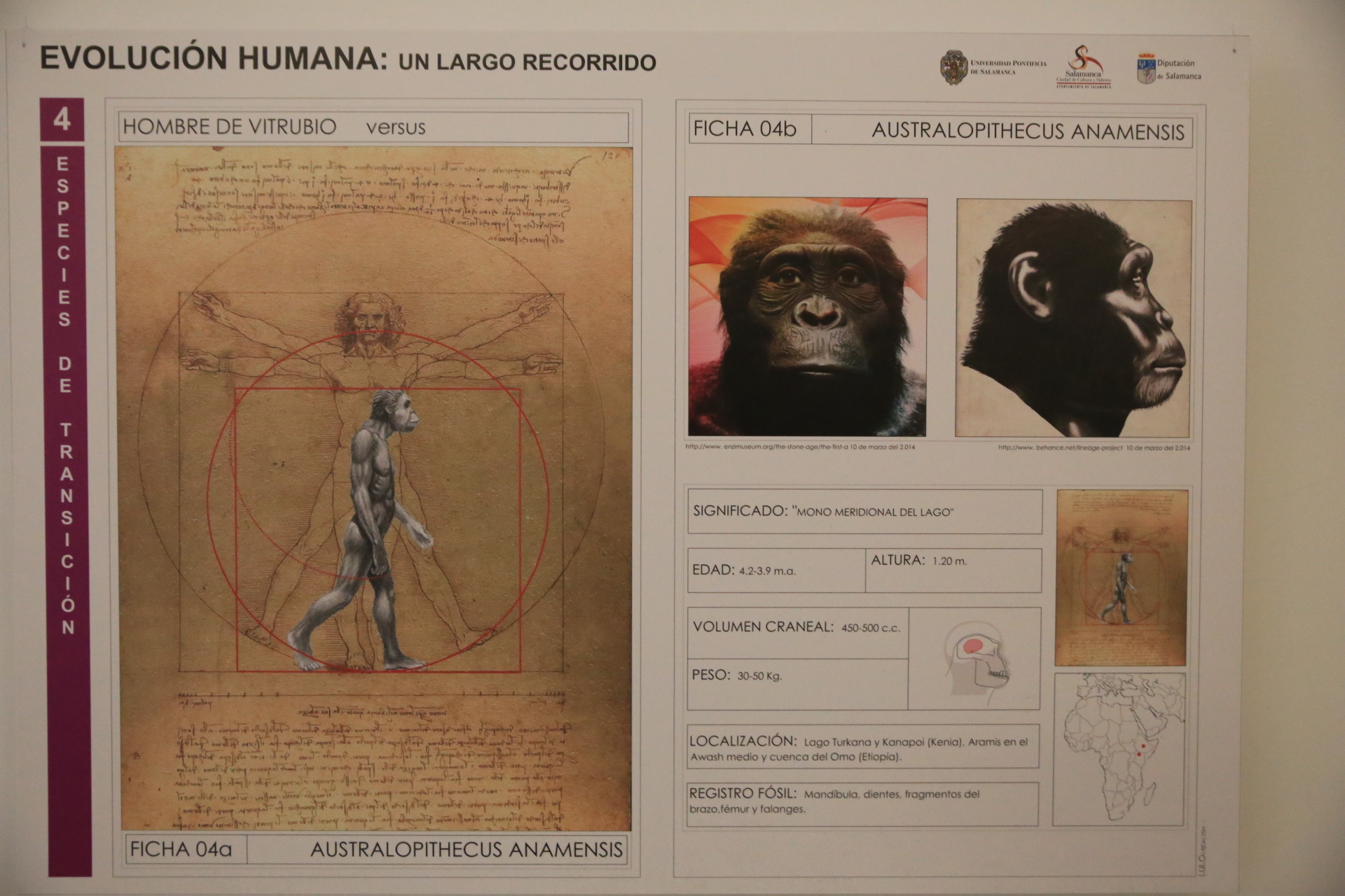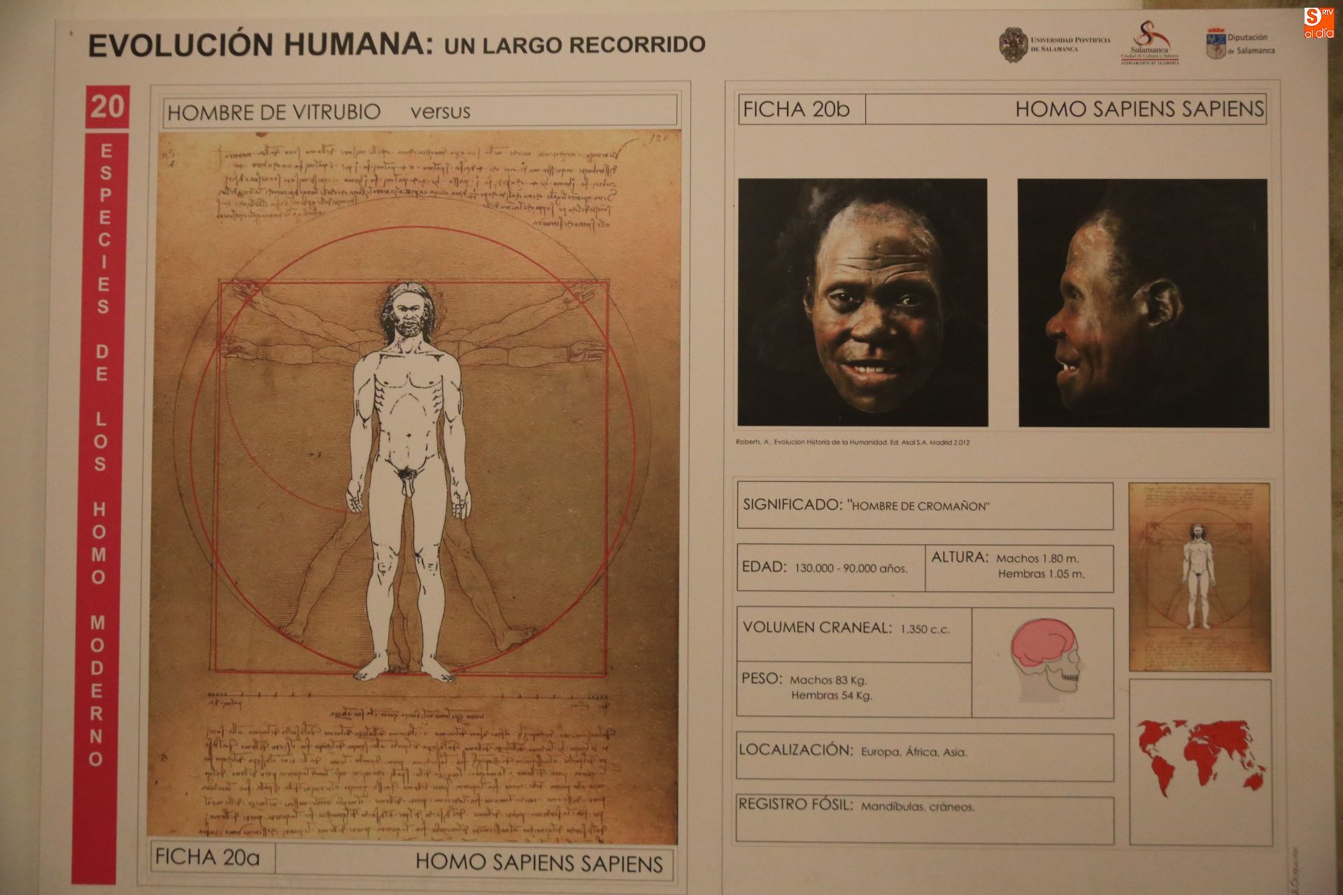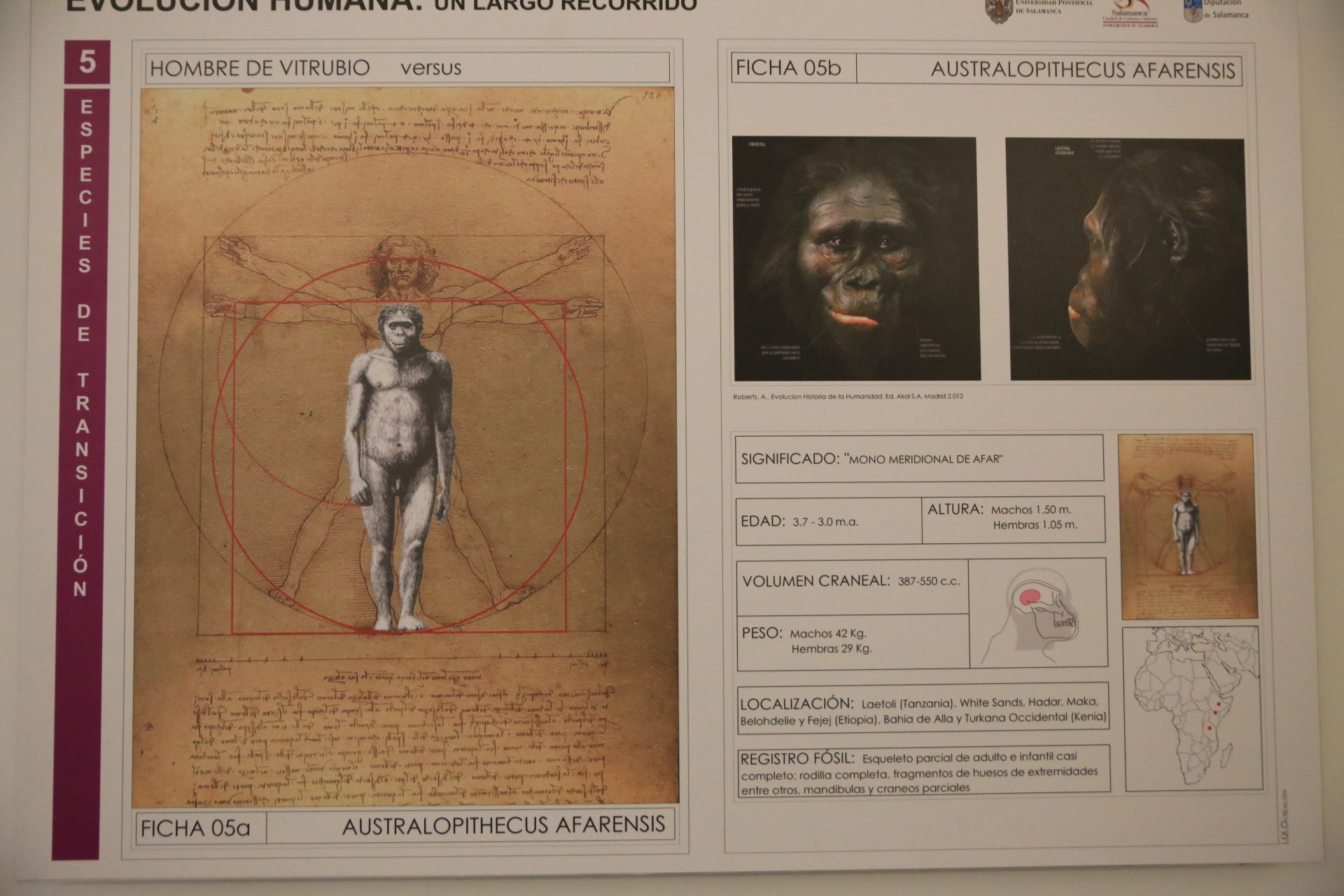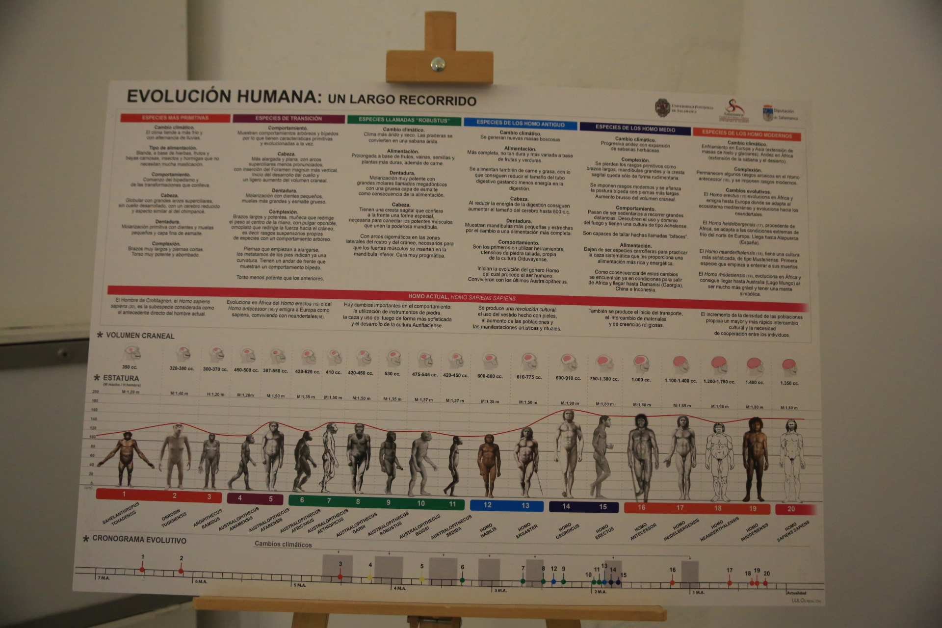 La muestra plasma, a través de 21 paneles gráficos, un recorrido sobre las diferentes etapas de la evolución humana. Tiene un carácter divulgativo y recoge los diferentes periodos evolutivos de la especie humana. Los distintos estadios muestran desde las especies más primitivas hasta las de los 'Homo Modernos', pasando por la influencia de las especies de transición, las llamadas 'robustus', las especies de los 'Homo Antiguo' y las especies de los 'Homo Medio'. Cada uno de los paneles muestra las variables comparativas de cada una de estas etapas, haciendo especial referencia a la alimentación, el comportamiento, el volumen craneal, la complexión y los cambios evolutivos.