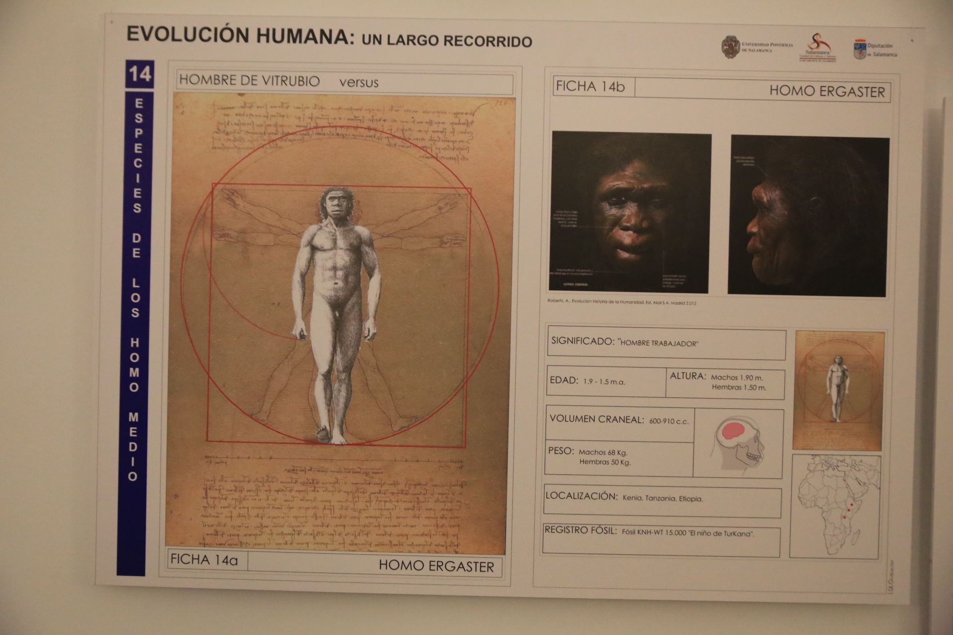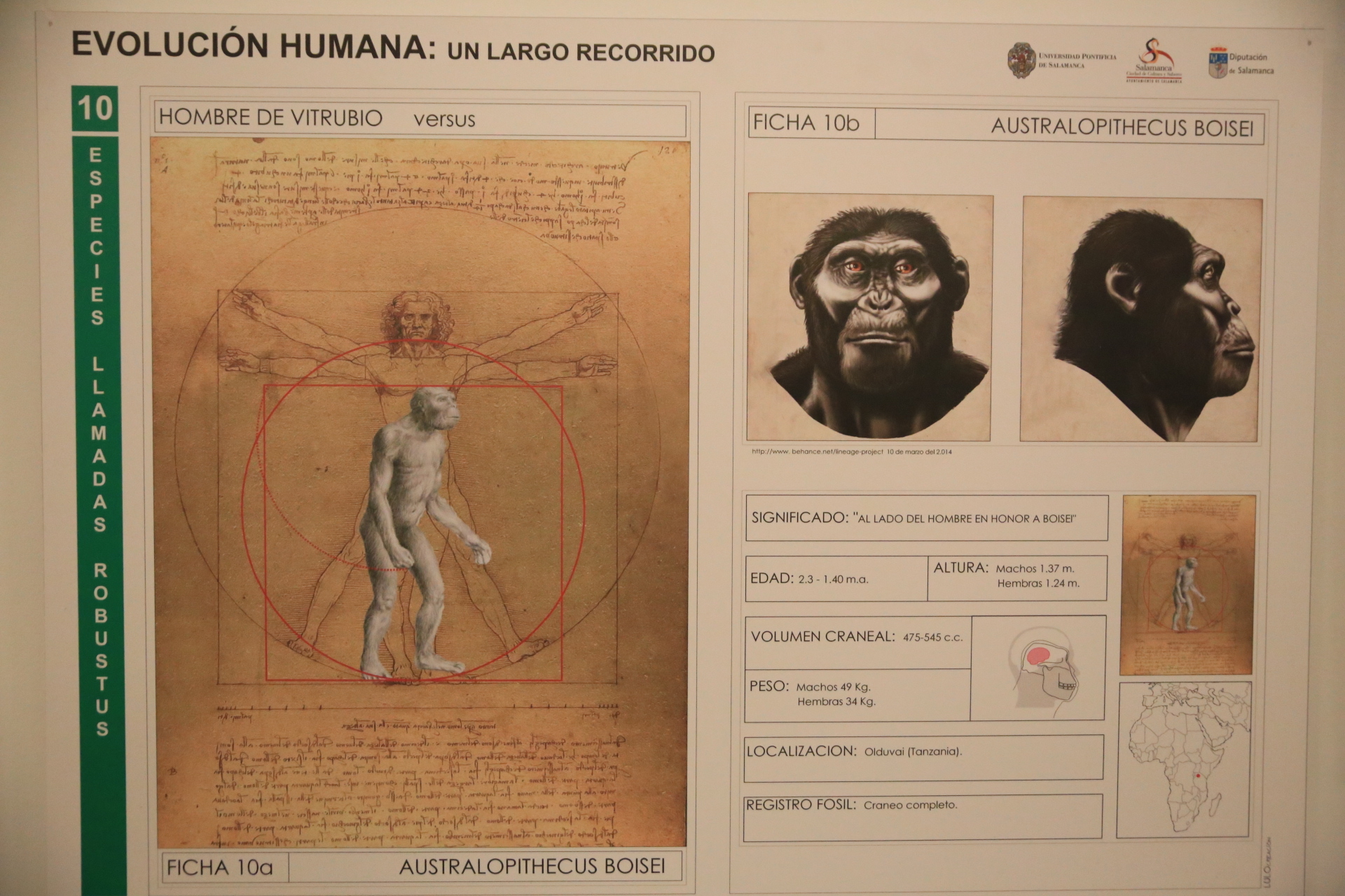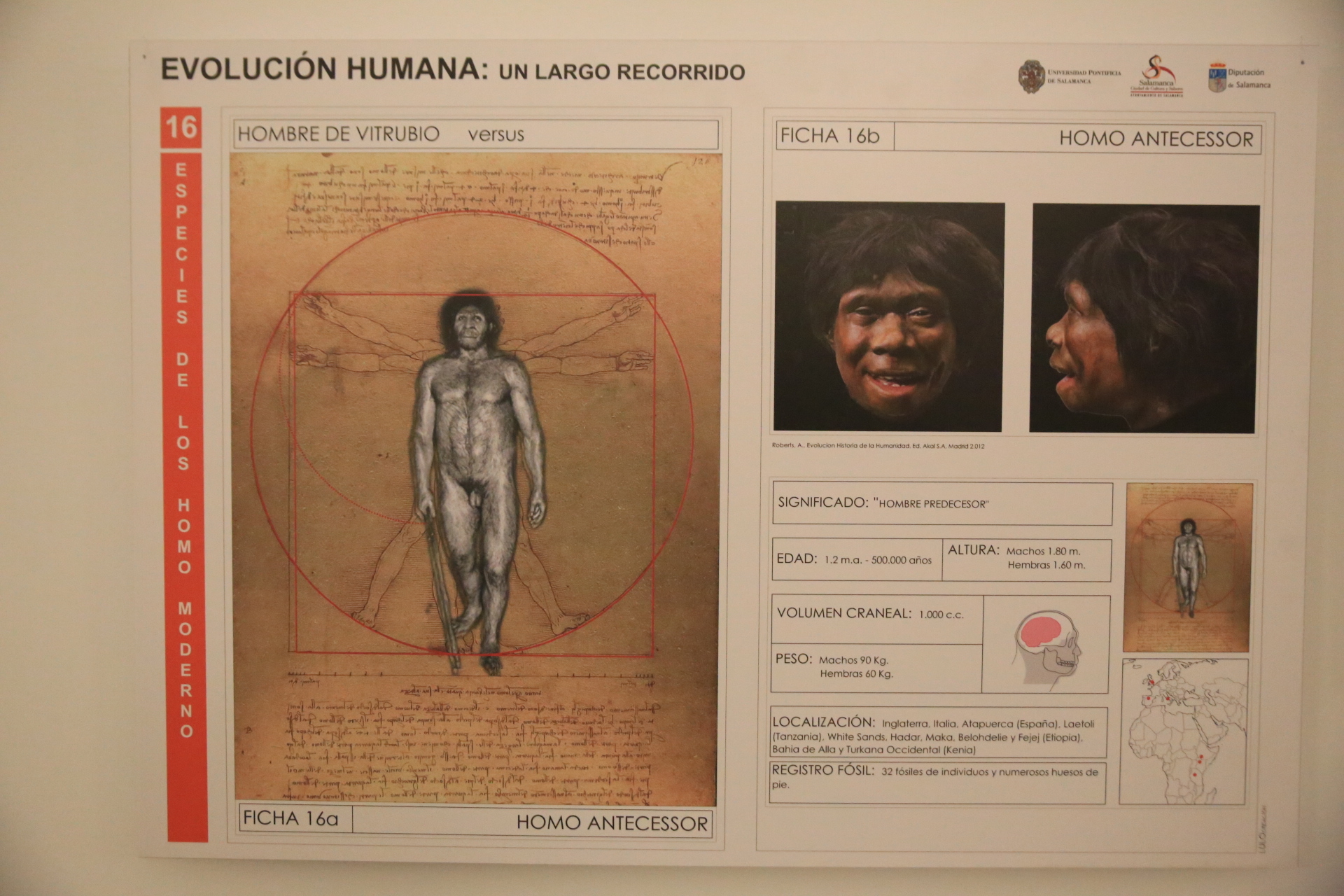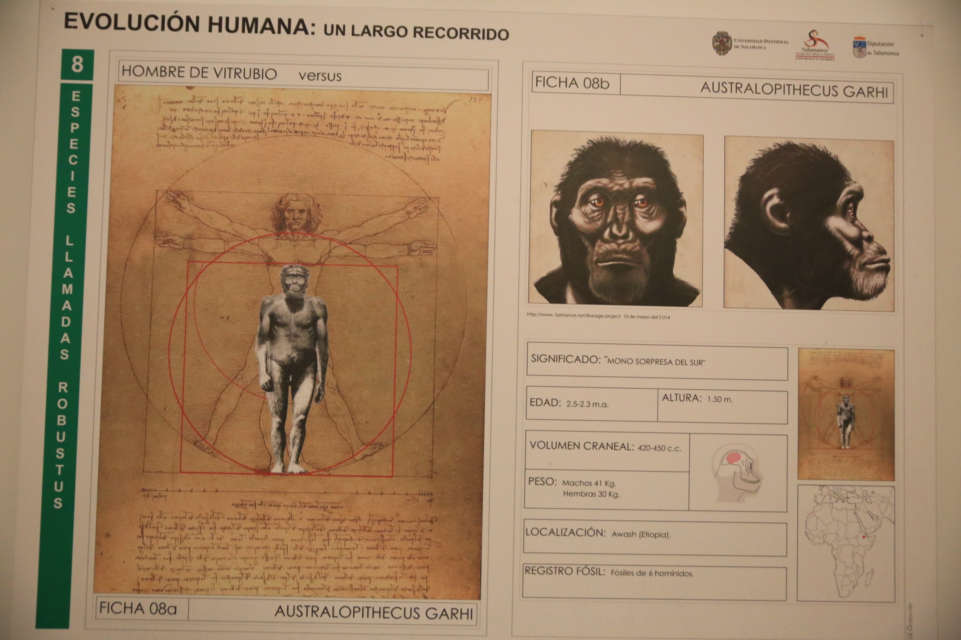 La muestra plasma, a través de 21 paneles gráficos, un recorrido sobre las diferentes etapas de la evolución humana. Tiene un carácter divulgativo y recoge los diferentes periodos evolutivos de la especie humana. Los distintos estadios muestran desde las especies más primitivas hasta las de los 'Homo Modernos', pasando por la influencia de las especies de transición, las llamadas 'robustus', las especies de los 'Homo Antiguo' y las especies de los 'Homo Medio'. Cada uno de los paneles muestra las variables comparativas de cada una de estas etapas, haciendo especial referencia a la alimentación, el comportamiento, el volumen craneal, la complexión y los cambios evolutivos.