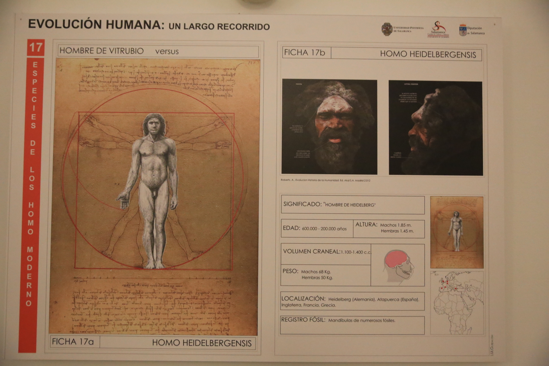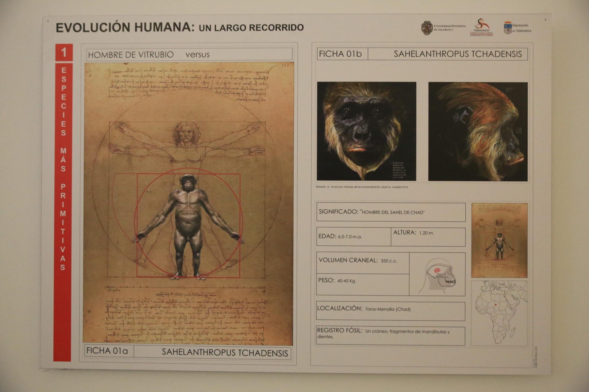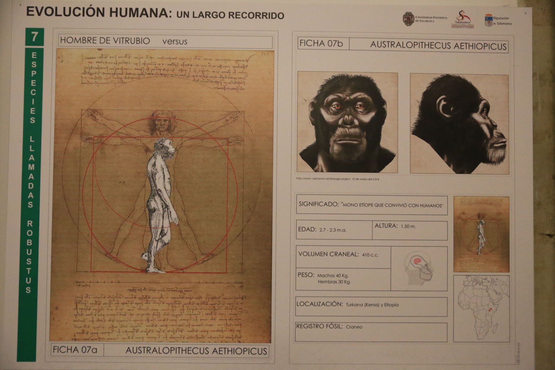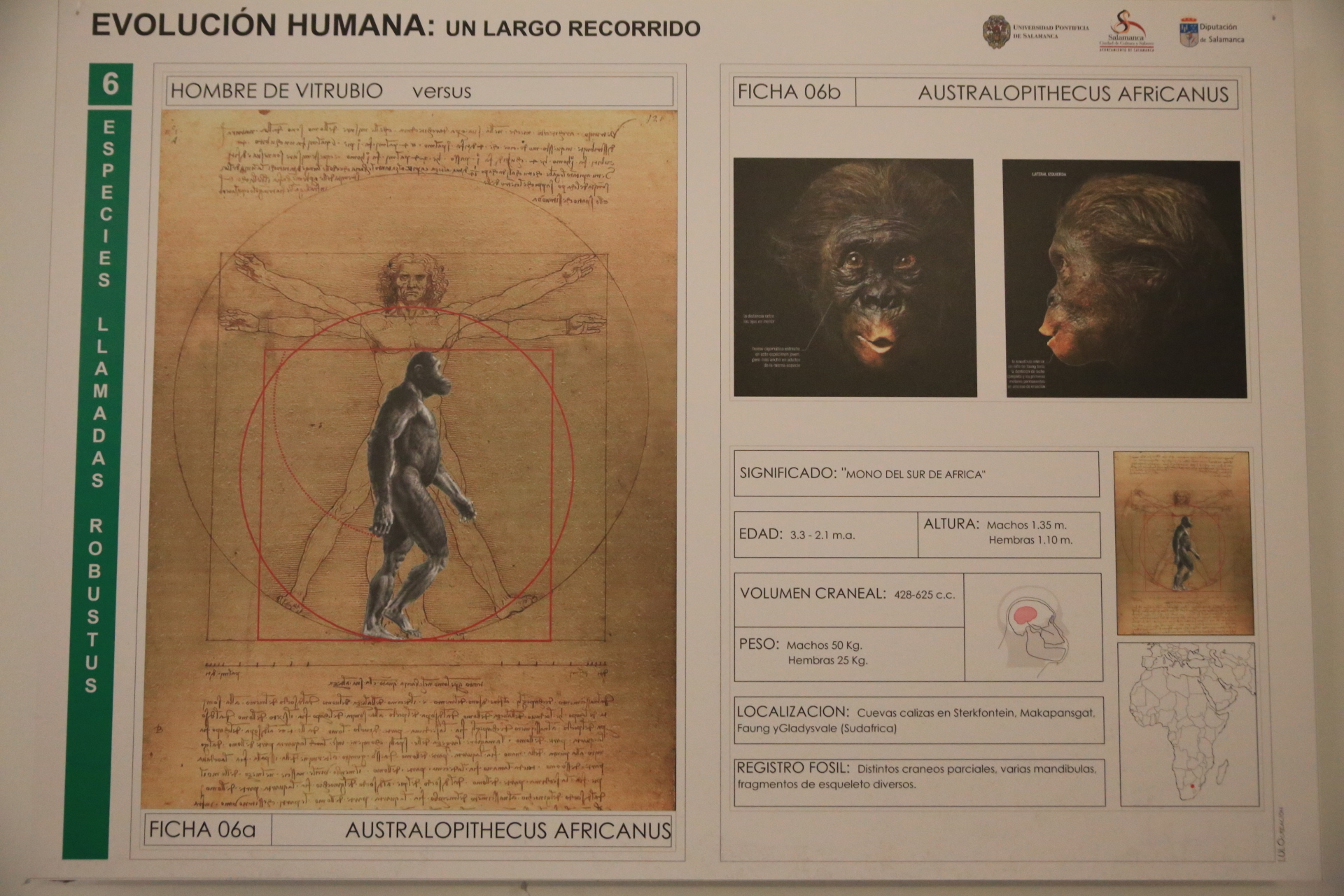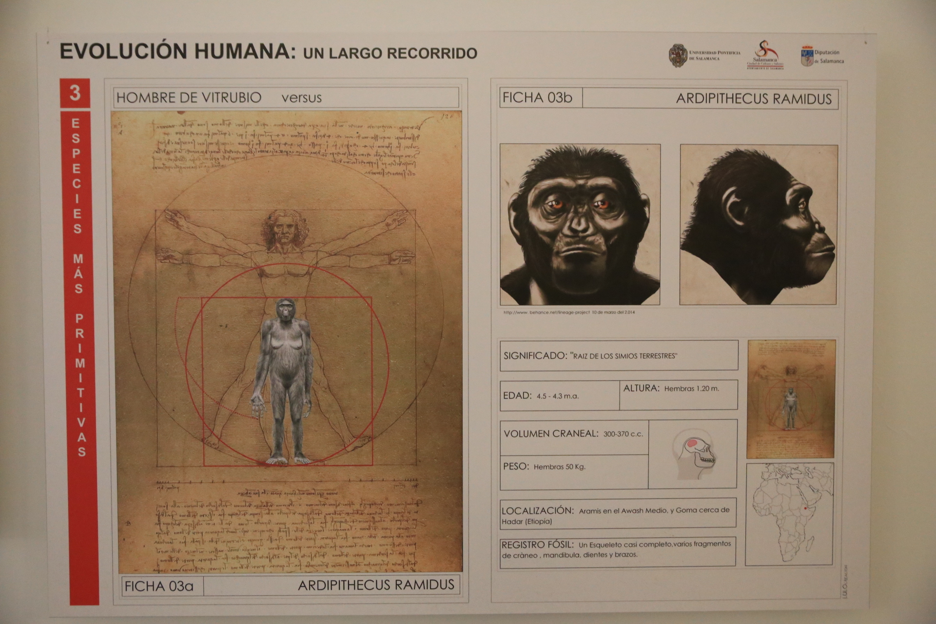 La muestra plasma, a través de 21 paneles gráficos, un recorrido sobre las diferentes etapas de la evolución humana. Tiene un carácter divulgativo y recoge los diferentes periodos evolutivos de la especie humana. Los distintos estadios muestran desde las especies más primitivas hasta las de los 'Homo Modernos', pasando por la influencia de las especies de transición, las llamadas 'robustus', las especies de los 'Homo Antiguo' y las especies de los 'Homo Medio'. Cada uno de los paneles muestra las variables comparativas de cada una de estas etapas, haciendo especial referencia a la alimentación, el comportamiento, el volumen craneal, la complexión y los cambios evolutivos.
