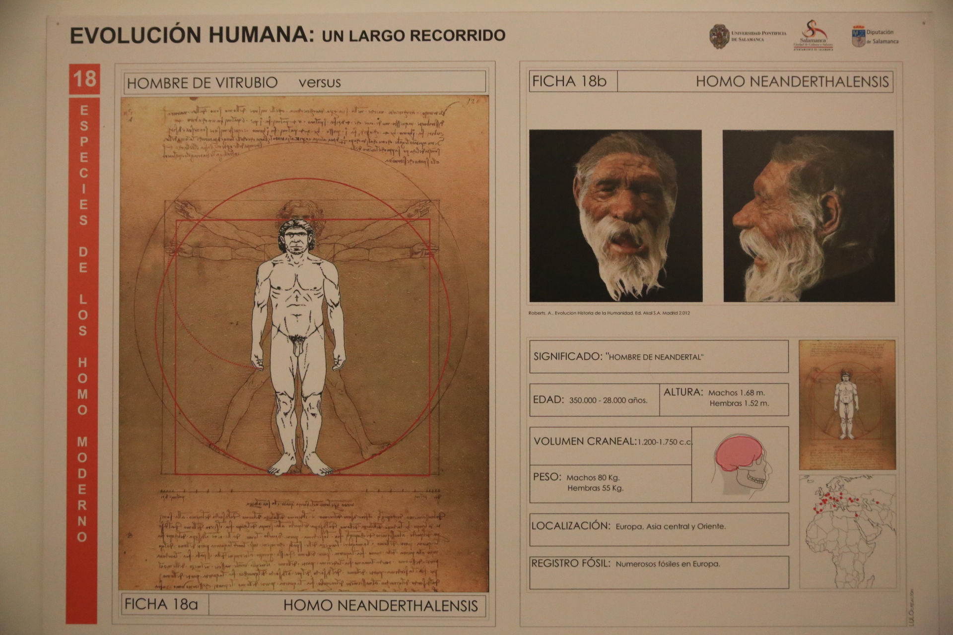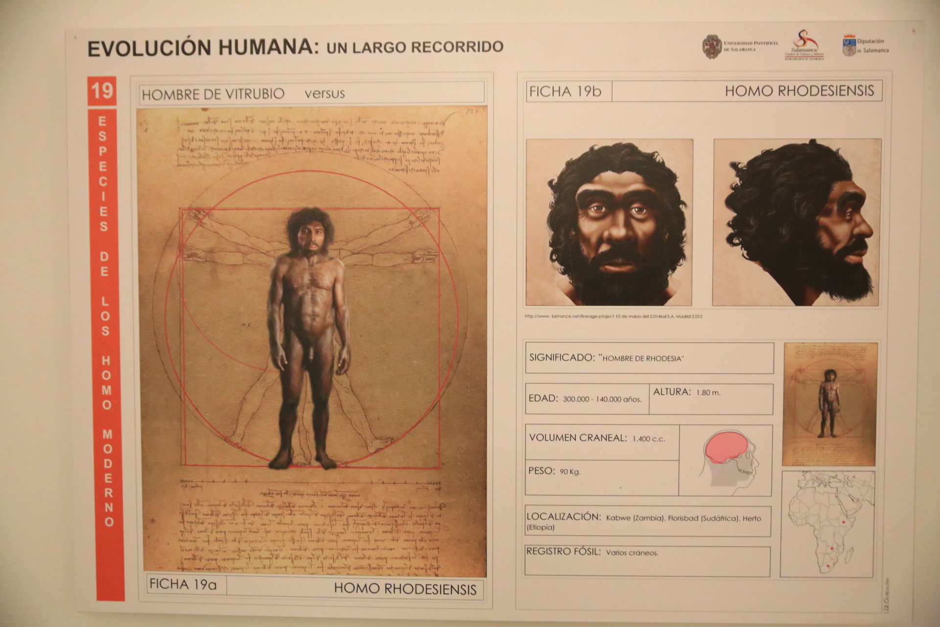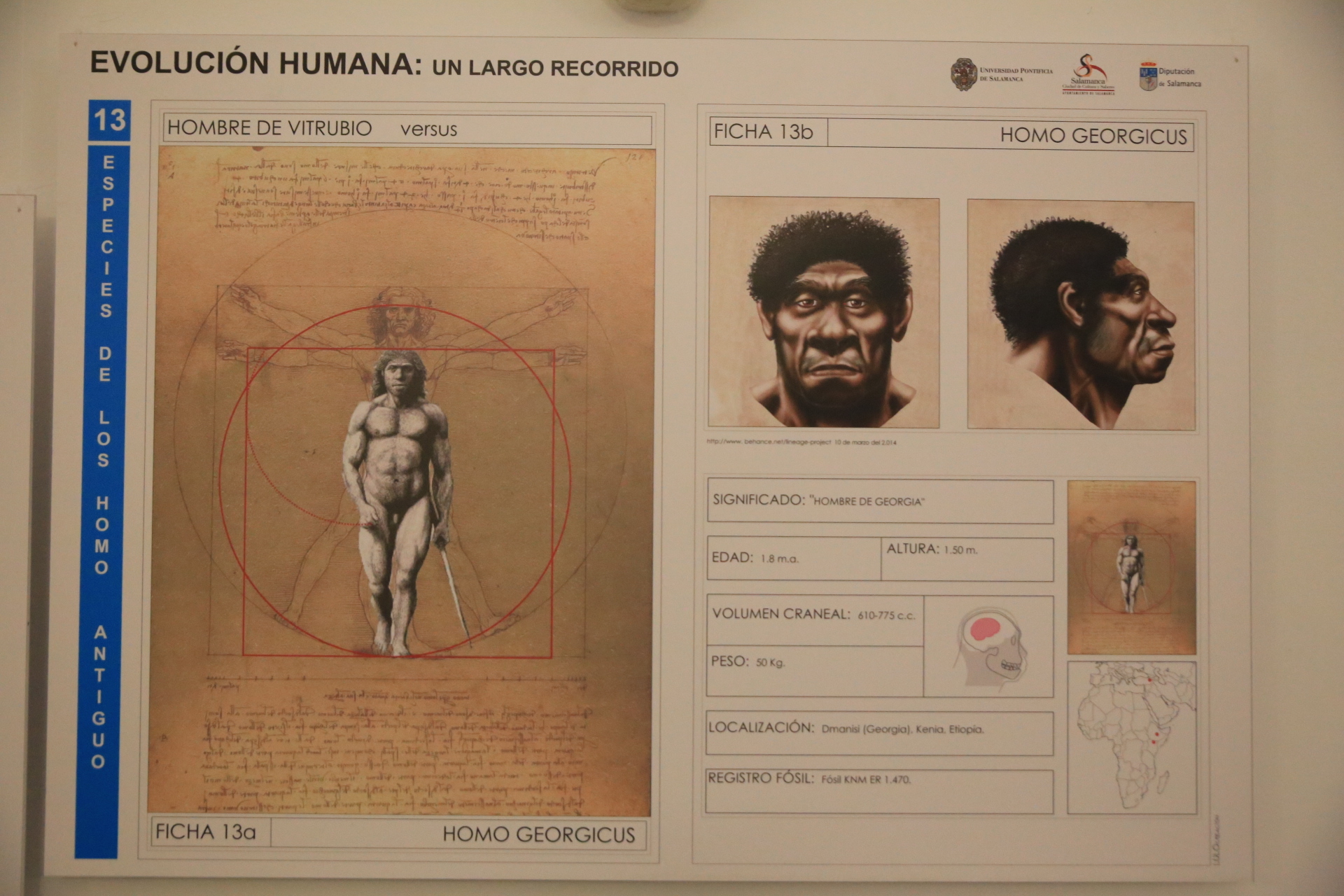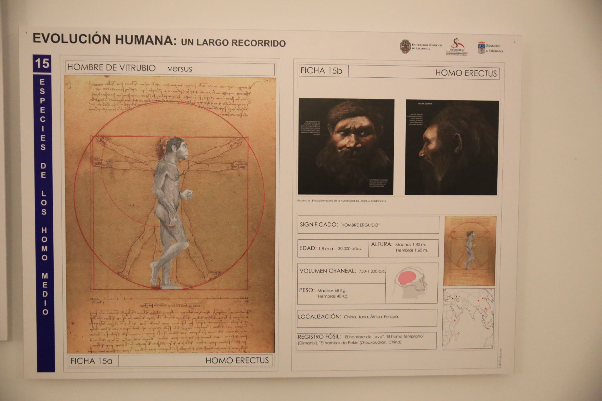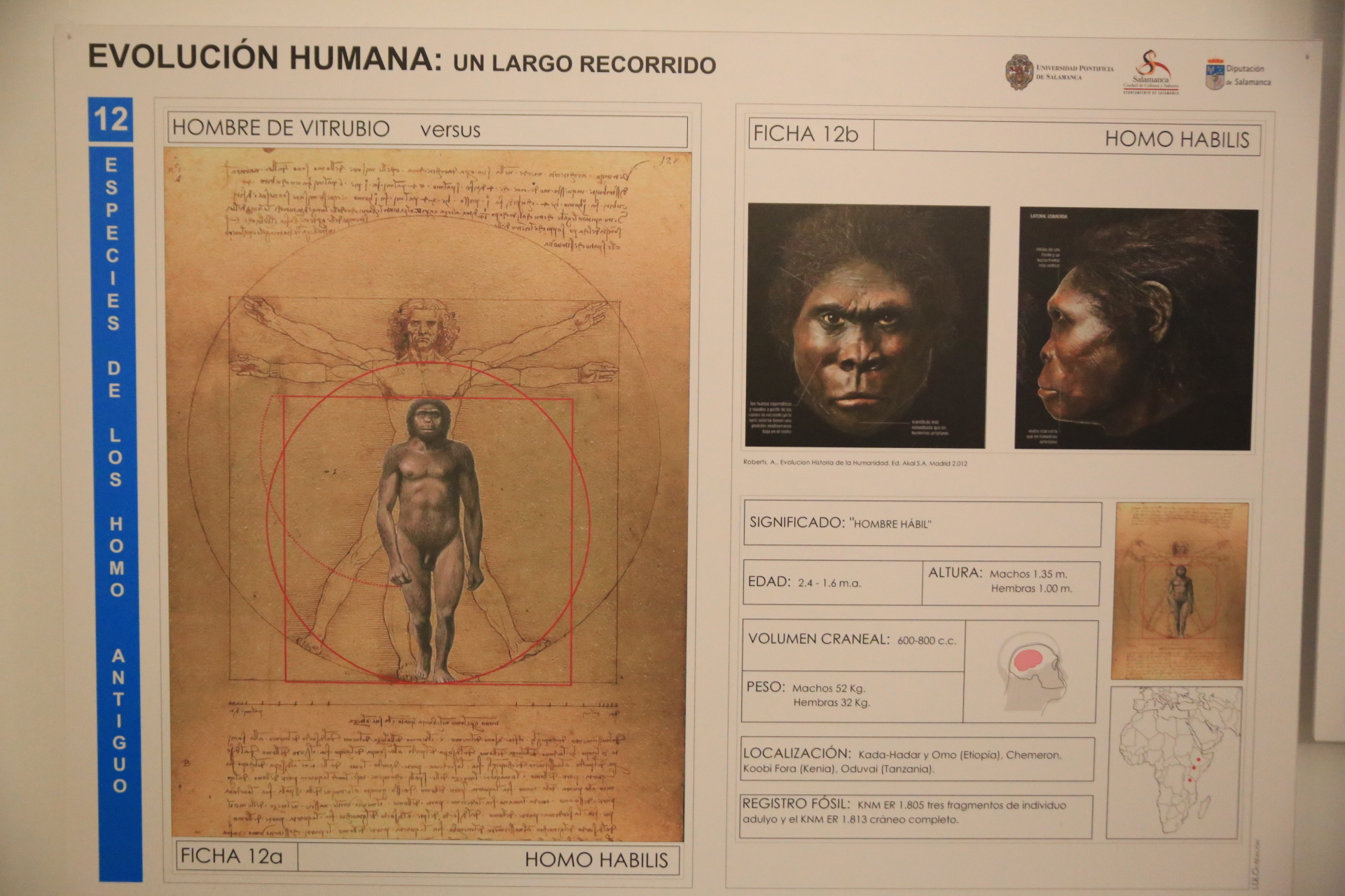 La muestra plasma, a través de 21 paneles gráficos, un recorrido sobre las diferentes etapas de la evolución humana. Tiene un carácter divulgativo y recoge los diferentes periodos evolutivos de la especie humana. Los distintos estadios muestran desde las especies más primitivas hasta las de los 'Homo Modernos', pasando por la influencia de las especies de transición, las llamadas 'robustus', las especies de los 'Homo Antiguo' y las especies de los 'Homo Medio'. Cada uno de los paneles muestra las variables comparativas de cada una de estas etapas, haciendo especial referencia a la alimentación, el comportamiento, el volumen craneal, la complexión y los cambios evolutivos.