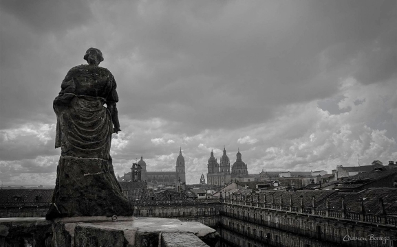 "Desde su atalaya, las figuras alegóricas de la Industria, la Agricultura, la Poesía y la Música se alzan de puntillas sobre la Plaza Mayor para mirar, entre las nubes, el alto soto de torres de Salamanca. Deseosas de paseo, de suelo resbaladizo, de libros y gentes, de plaza y encuentro? sin embargo, su horizonte es la nube y las torres próximas, cercanas de esta Salamanca inédita", expone la escritora Charo Alonso al ver esta imagen.