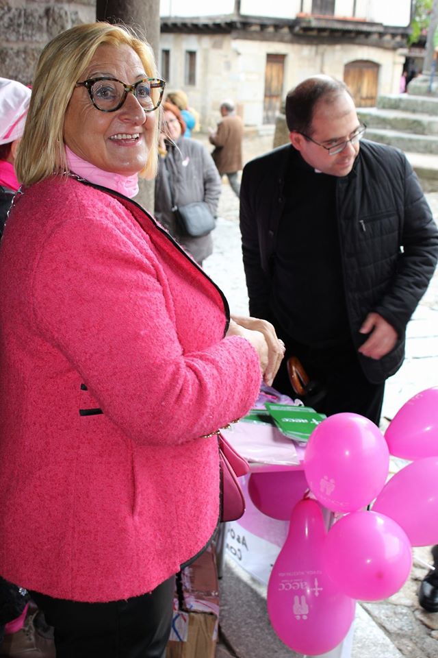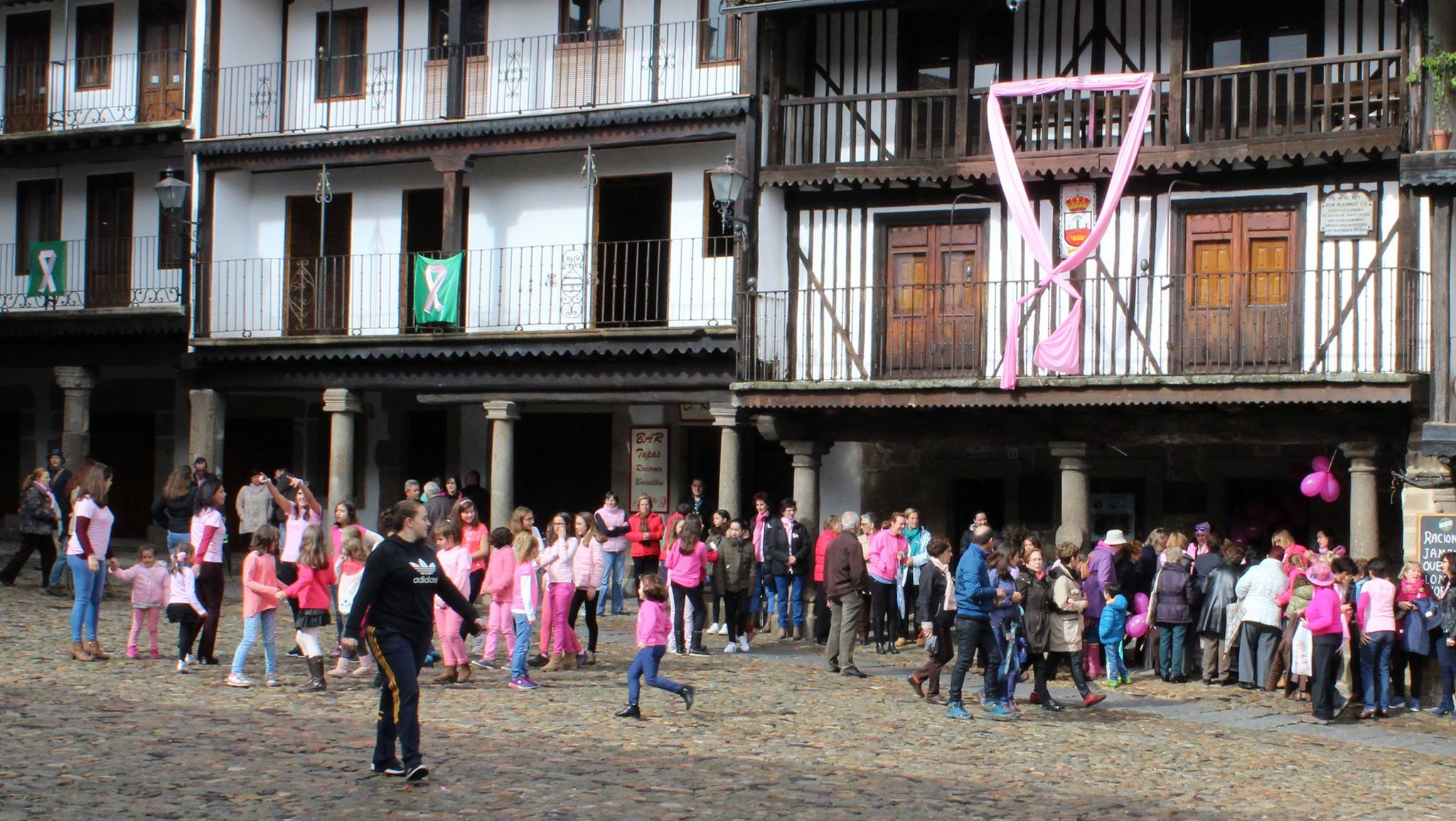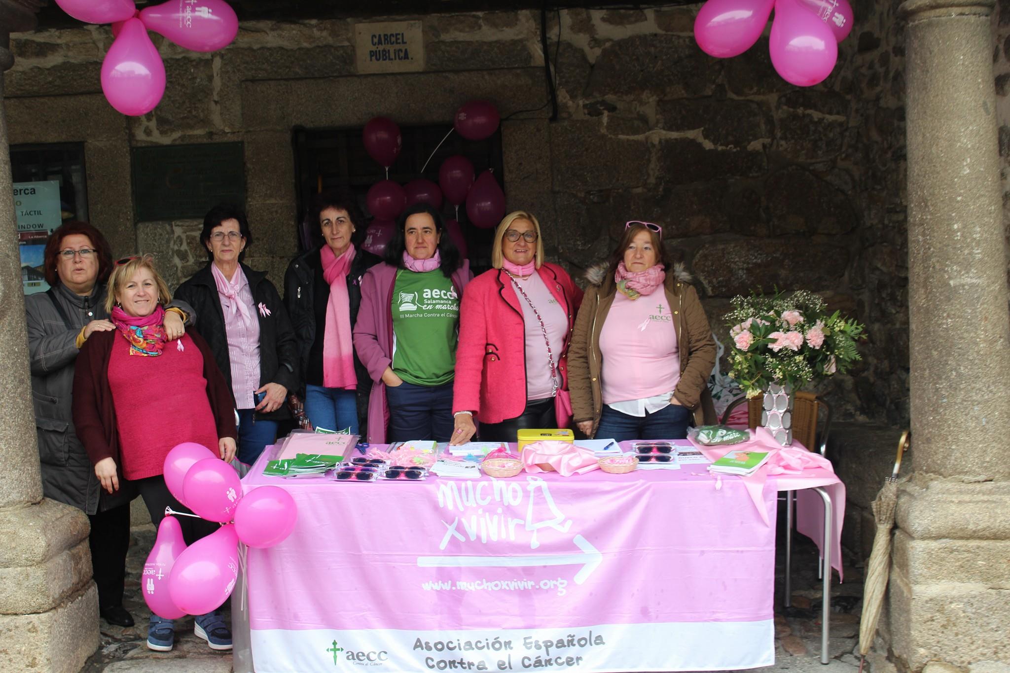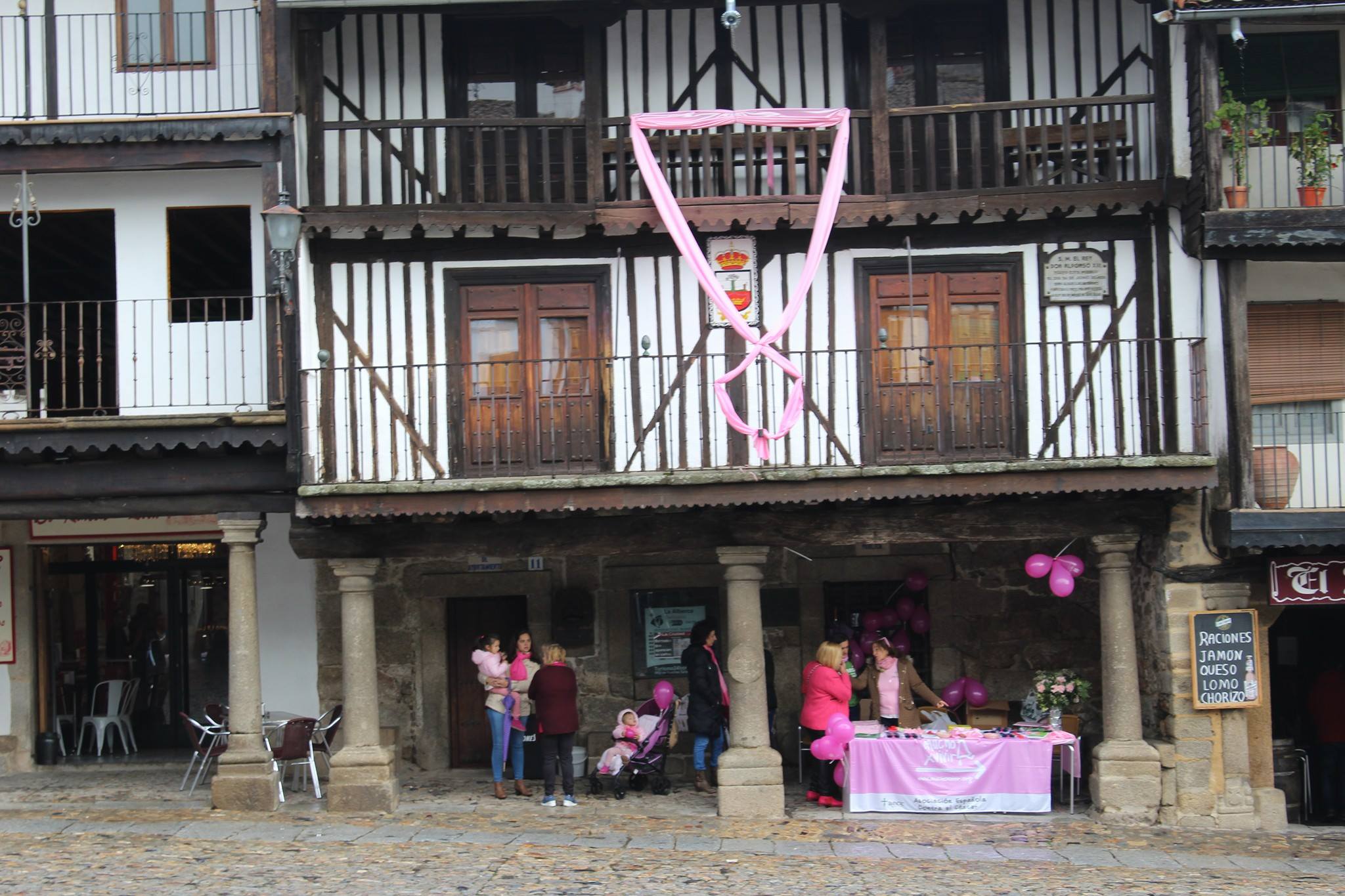 La Alberca mostró esta mañana su lado más solidario con la celebración de los actos conmemorativos del Día Mundial del Cáncer de Mama, que tuvo lugar el pasado miércoles. La Asociación Española Contra el Cáncer instaló un stand en el soportal del Ayuntamiento, mientras que el balcón del Consistorio mostró un lazo rosa de gran tamaño. Con ese escenario, la primera actividad con