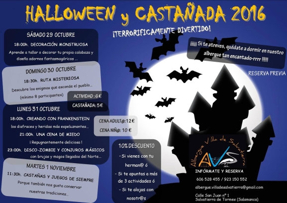 Salvatierra de Tormes se prepara para celebrar Halloween con una programación de actividades que se ofertan a través del Albergue Villa de Salvatierra. Se comenzará el sábado 29 de octubre con un taller de decoración monstruosa a partir de las 18:00 horas. El domingo será momento de la 'Ruta Misteriosa', en la que se descubrirán los enigmas que esconde el pueblo. Comenzará a las 18:3