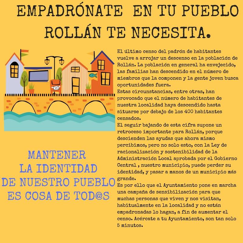 Empadrónate en tu pueblo, Rollán te necesita. Con este mensaje, el Ayuntamiento de Rollán ha emprendido una nueva campaña de sensibilización para que "aquellas personas que viven y nos visitan habitualmente, y no están empadronadas en el municipio, lo hagan a fin de aumentar el censo". Un trámite que se realiza en poco más de 5 minutos, como recuerdan desde el Ayuntamiento.
