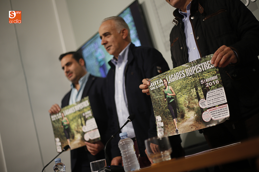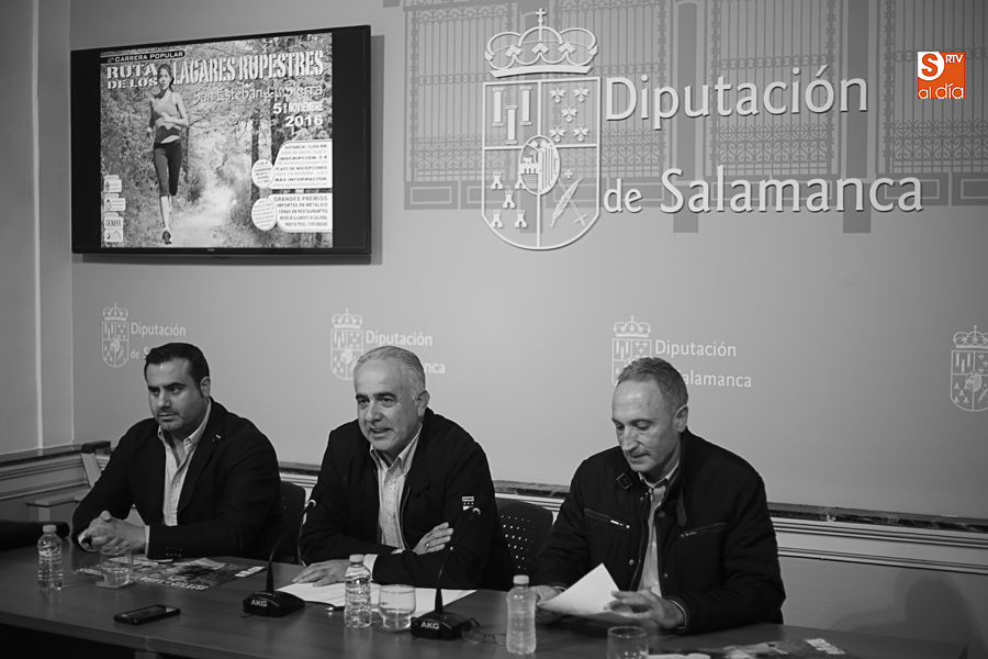 El diputado de Deportes, Jesús María Ortiz, el alcalde de San Esteban de la Sierra, Antonio Agustín Labrador, y el delegado de la Federación de Atletismo en Salamanca, Moisés Muñoz, han presentado este jueves, en la Diputación, la "Ruta de los Lagares".