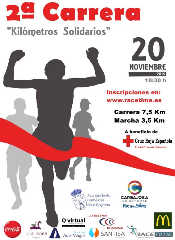 Un año más vuelve la Carrera Popular 'Kilómetros Solidarios'. Está segunda edición tendrá lugar en la localidad de Carbajosa de la Sagrada el próximo domingo 20 de Noviembre a partir de las 10.30 horas.