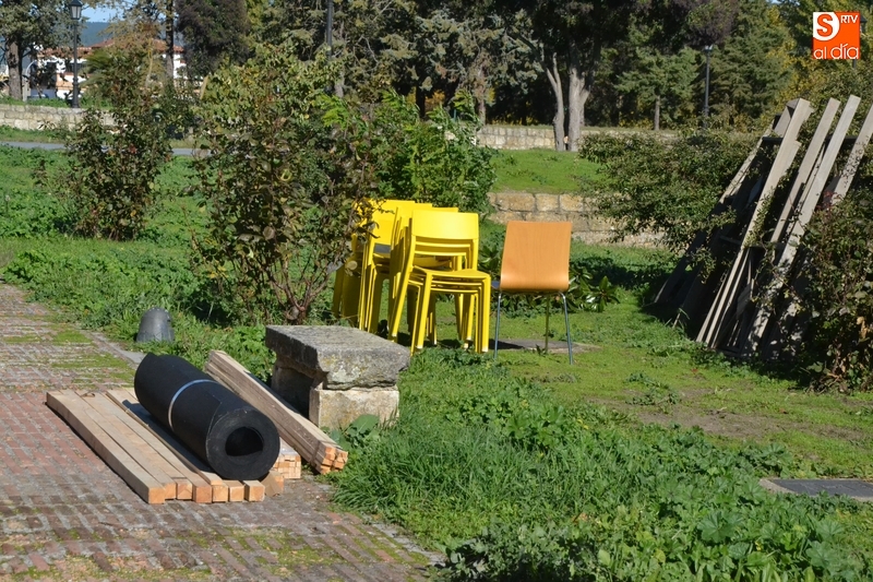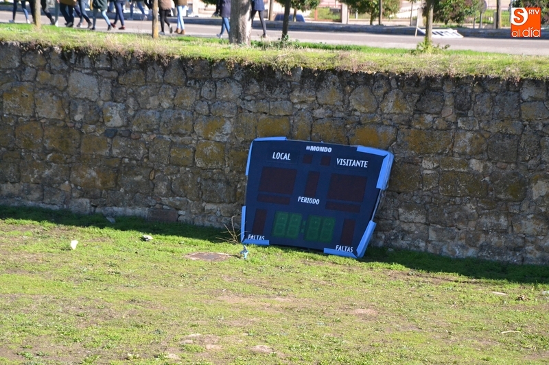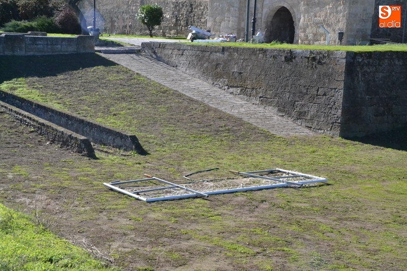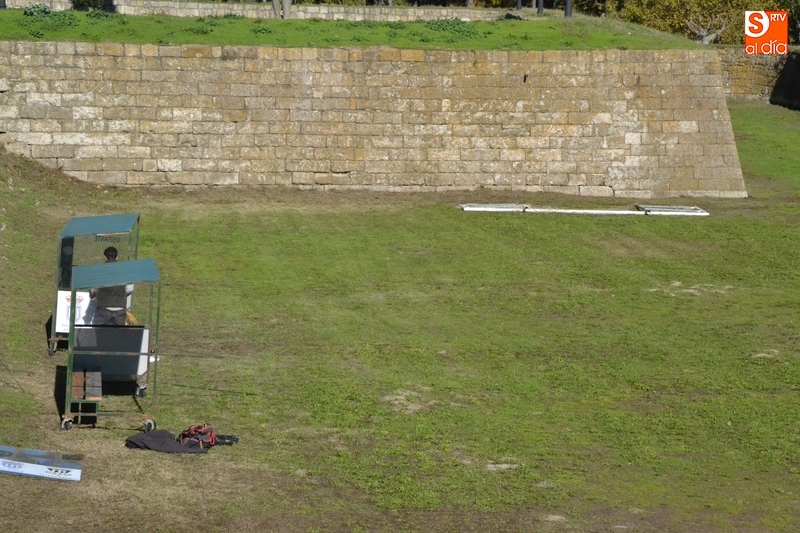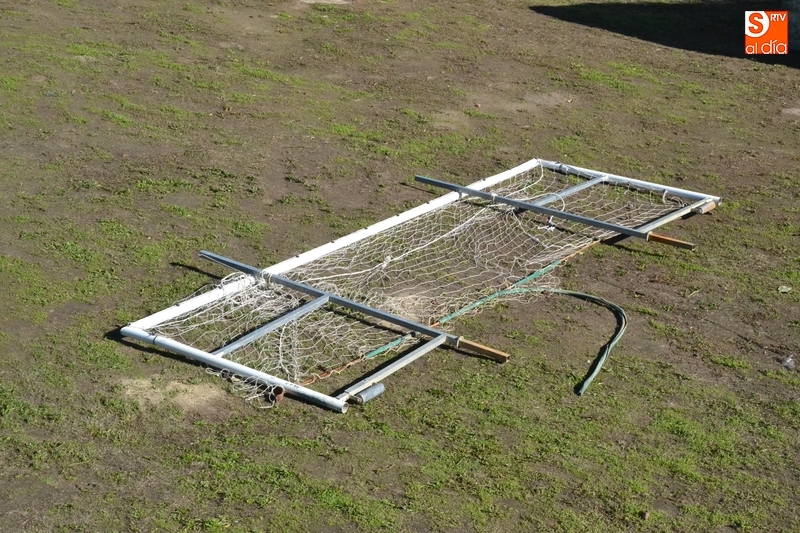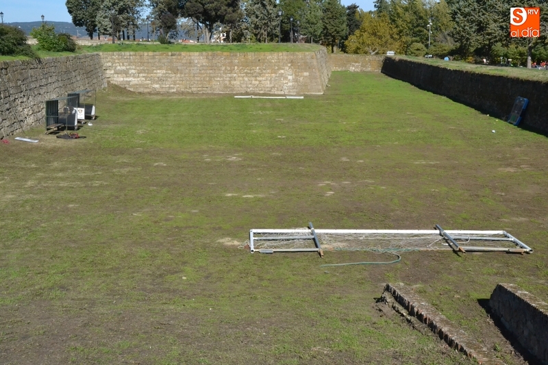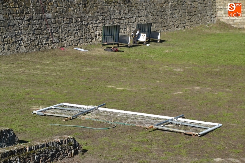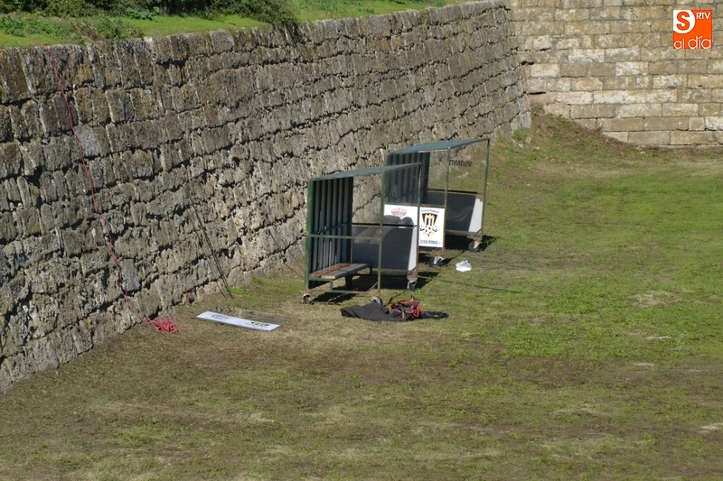 De este modo, en la mañana del lunes se empezó a trabajar en la instalación en el foso de dos porterías y dos banquillos, pertenecientes a las instalaciones deportivas de Ciudad Rodrigo. Como es lógico, un operario estaba retirando los escudos del Ciudad Rodrigo Club de Fútbol que lucen en esos banquillos, cuya ubicación habitual son los Campos de Toñete.