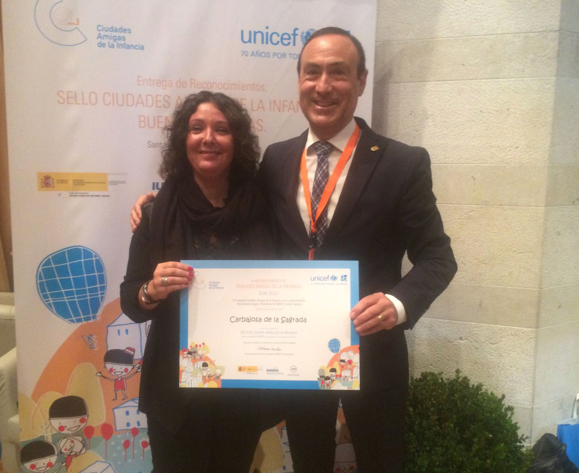 El Ayuntamiento de Carbajosa ha recogido esta mañana en Santander el reconocimiento del municipio como Ciudad Amiga de la Infancia, título que distingue el trabajo de los municipios a favor de los derechos de la infancia y la adolescencia El alcalde, Pedro Samuel Martín, quien ha asistido a este acto acompañado de la concejala de Educación Águeda Arranz, ha sido el encargado de recoger este título en representación del municipio.