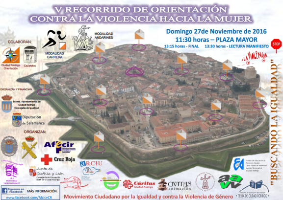El Movimiento Ciudadano por la Igualdad y contra la Violencia de Género de Ciudad Rodrigo ha convocado para el próximo domingo 27 de noviembre el V Recorrido de Orientación contra la Violencia hacia la Mujer, con motivo de la conmemoración dos días antes del Día Internacional para la Eliminación de la Violencia contra las Mujeres.