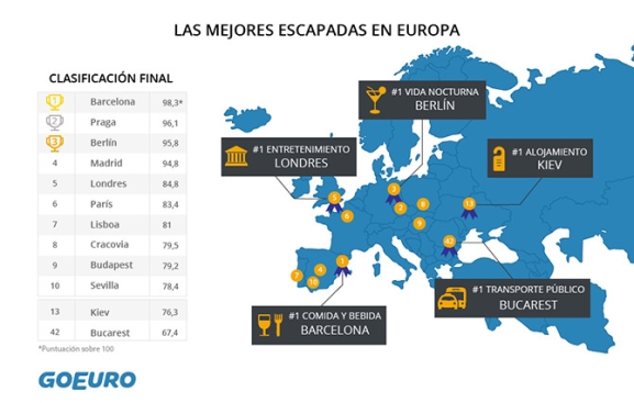 GoEuro, ha elaborado un estudio en el que valora cuáles son las 100 ciudades de Europa más apetecibles para hacer una escapada. En él se tienen en cuenta factores como el entretenimiento, la vida nocturna, el alojamiento, la gastronomía y el transporte público. Estas variantes se califican teniendo en cuenta oferta, nivel de precios y calidad, entre otros. Asimismo, todas ellas se ponderan con un baremo cuyo máximo escalón es 5.