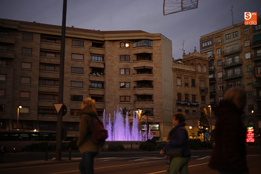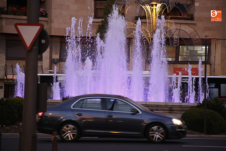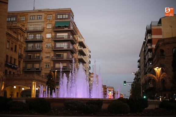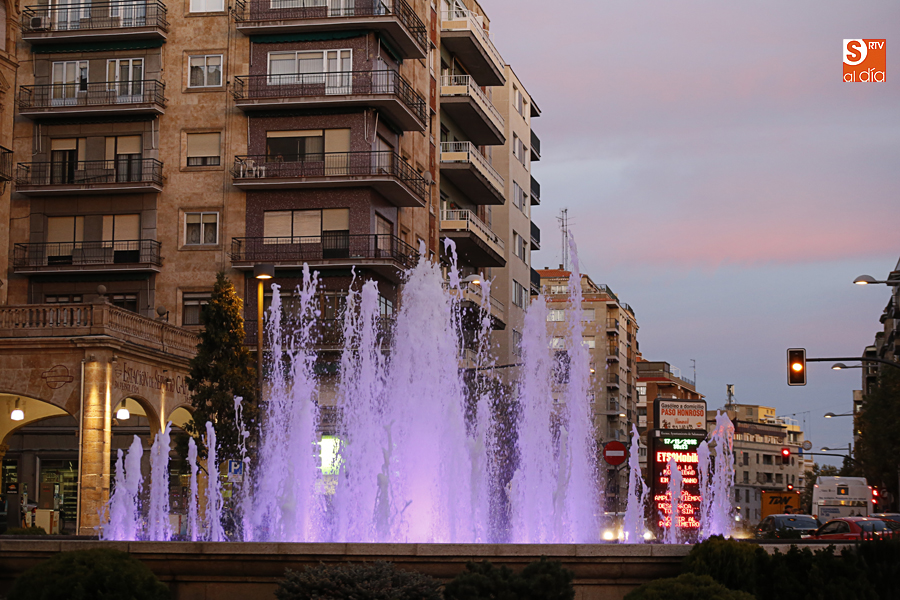 La fuente de la Puerta Zamora se ha iluminado hoy de color morado con motivo del Día Internacional del Prematuro. El Ayuntamiento de Salamanca se suma con esta iniciativa a los actos organizados por la Asociación de Familias de Niños Prematuros y Asimilados de Castilla y León (PREMYA), que se creó el año pasado para ofrecer apoyo a todas las familias que viven esta situación.