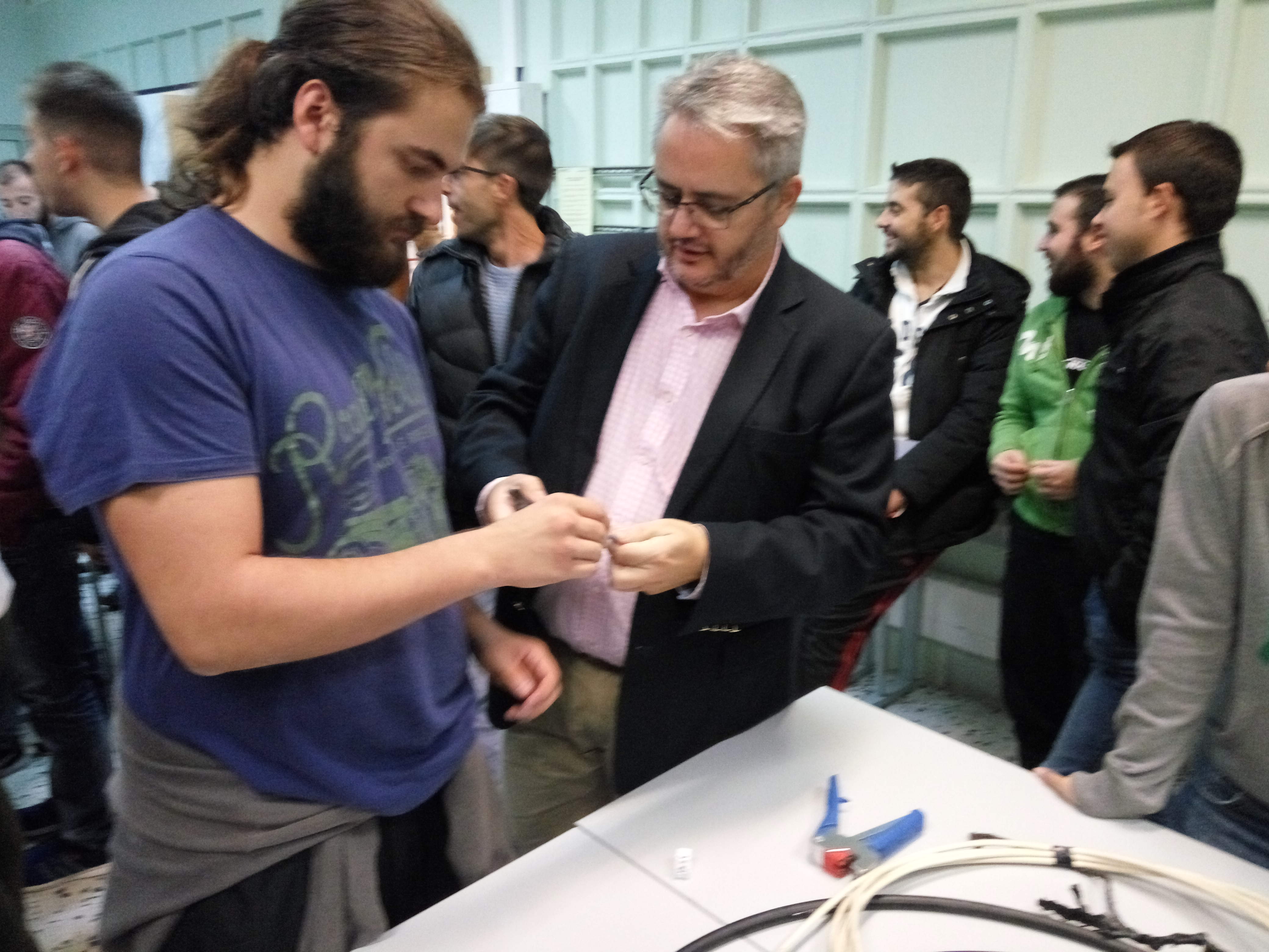 Tras una primera parte teórica destinada a adquirir los conocimientos básicos en materia de 'Fibra óptica y sistema cableado estructurado de cobre', el alumnado pudo disfrutar de la parte práctica fusionando fibra óptica, realizando empalmes de fibra óptica mecánicamente, y comprobando si la fusión que habían realizado estaba correcta o no con el láser localizador visual de fibras que entusiasmó tanto al alumnado como al profesorado asistente a esta jornada técnica gracias a la dedicación y profesionalidad de Sixto, Jaime y Rubén.