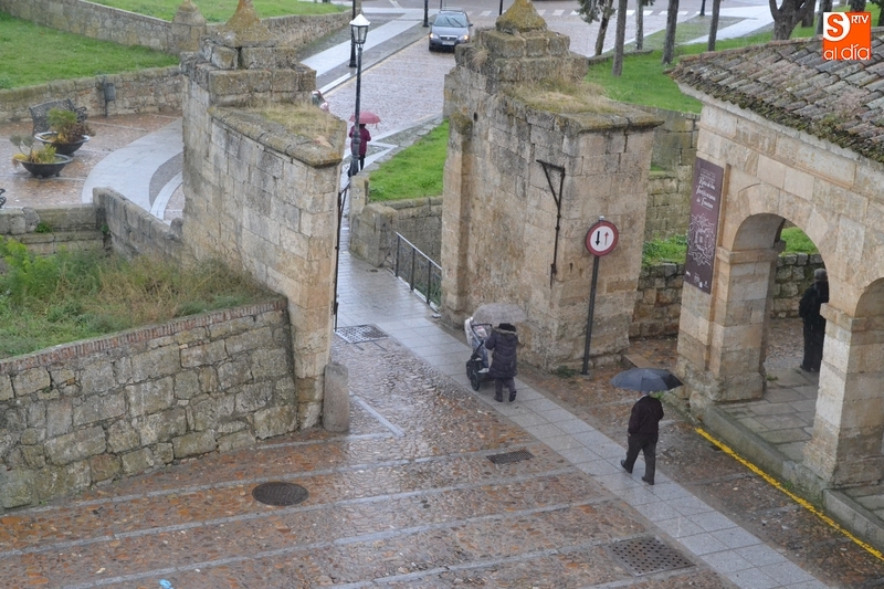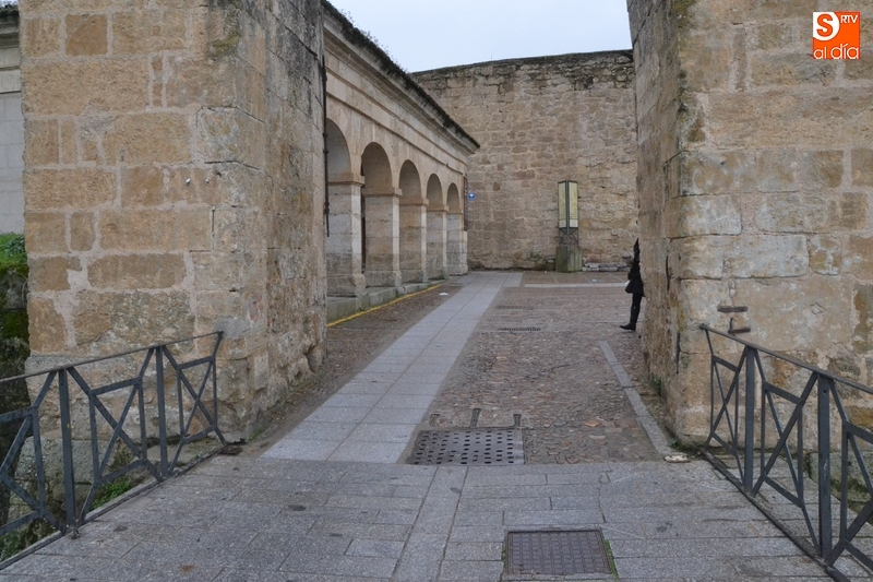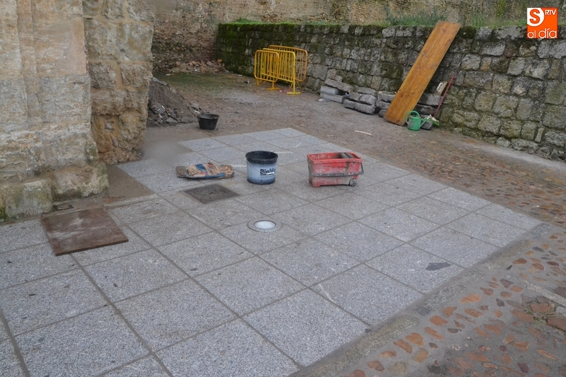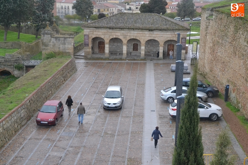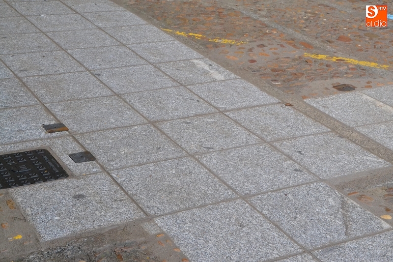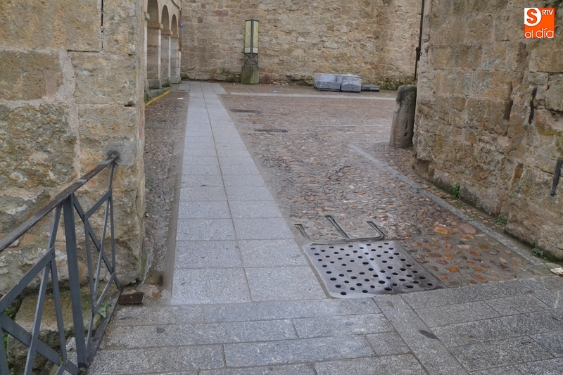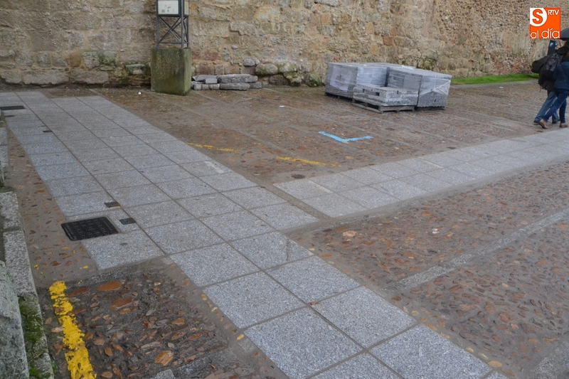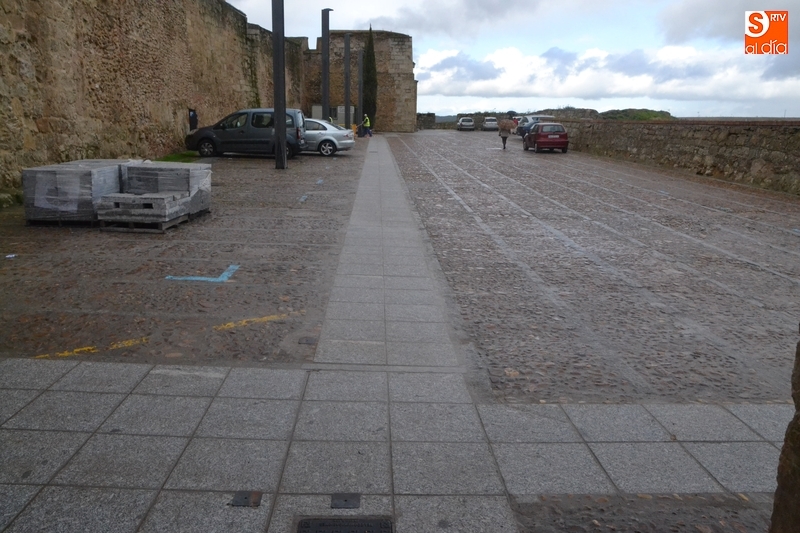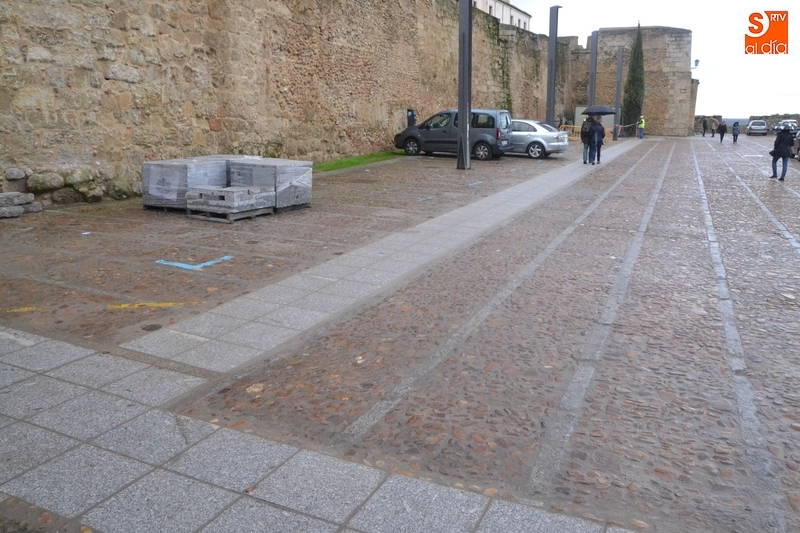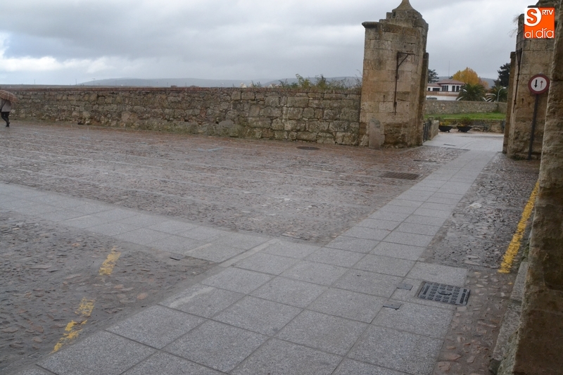 La zona del Registro de Ciudad Rodrigo ya está reabierta al tráfico de vehículos tras culminar las obras de construcción de un carril de losetas a lo largo del espacio para facilitar la movilidad a personas con movilidad reducida, que vayan empujando por ejemplo un carrito de bebé, o que vayan con tacones.